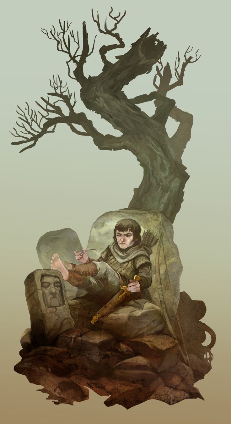 Come si addice a uno dei personaggi più importanti dell’opera, Aragorn ha subito una varietà di cambiamenti prima di diventare l’aspro Ramingo-diventato-Re che conosciamo e amiamo. Iniziando la sua esistenza come hobbit, poi come elfo, poi infine come uomo, la sua importanza nella storia in quanto erede di Isildur si realizzò solo molto più tardi. All’inizio, il suo soprannome non era Grampasso (Strider), ma «Trotter» (Trottatore), che era accettabile per ciò che egli era: un peculiare hobbit con zoccoli di legno, che in seguito si scoprono nascondere qualche tipo di innominata tortura inflittagli dall’Oscuro Signore mentre era alla ricerca di Gollum; Tolkien scrive anche in una nota che si sarebbe rivelato che Trotter aveva piedi di legno. Possiamo considerarci fortunati se questo spunto non fu sviluppato ulteriormente. Interessante che la prima possibile identità di «Trotter» fosse quella di Peregrino Boffin (da non confondere con il Tuc dallo stesso nome), un nipote da tempo perduto di Bilbo. Tuttavia dopo essere diventato Aragorn (chiamato così dopo molte revisioni) il suo soprannome fu inspiegabilmente, ma appropriatamente, cambiato in Grampasso.