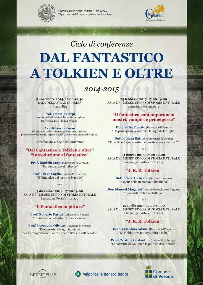 Dal 5 novembre 2014 e fino al 15 aprile 2015 si svolgerà invece il ciclo di conferenze Dal fantastico a Tolkien e oltre. Il ciclo si terrà nella sala convegni della Gran Guardia e organizzato dal Dipartimento di Lingue e Letterature Straniere dell’Università di Verona, in collaborazione con il Comune di Verona. Un’occasione di approfondimento e di confronto sul mondo della narrativa fantasy con una serie di appuntamenti didattico-informativi su temi che sono oggi di grande impatto sulla società contemporanea e in particolare sui giovani. Il ciclo si articolerà in cinque seminari, che vedranno la partecipazione di studiosi provenienti da ambiti disciplinari che spaziano dalla letteratura alla storia dell’arte, dalla religione alla medicina e al diritto. Gli incontri si terranno il mercoledì, dalle 17 alle 19, con il seguente programma: il 5 novembre, in Gran Guardia, “Dal Fantastico a Tolkien e oltre” – “Introduzione al fantastico”; successivamente, al museo Civico di Storia naturale, il 3 dicembre “Il fantastico in pittura”; il 25 febbraio “Il fantastico contemporaneo: mostri, vampiri e principesse”; l’11 marzo ed il 15 aprile “J. R. R. Tolkien”. L’iniziativa è gratuita ed aperta a tutti.
