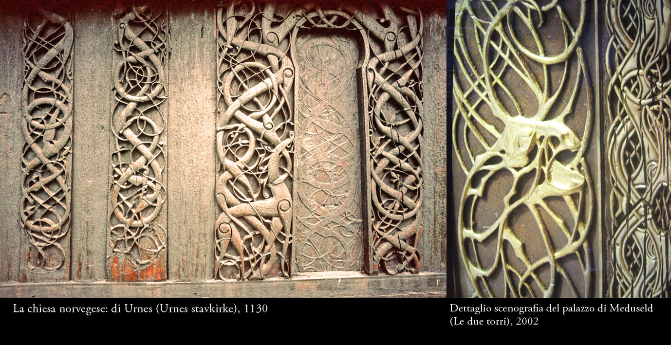 Il mondo dell’immagine in generale è pieno di opere frutto dell’ingegno di un artista palesemente ispirate a opere altrui, ma le somiglianze più incredibili si notano soprattutto nel cinema dei blockbuster hollywoodiani. Prendiamo come primo esempio i film di Peter Jackson. Non è un mistero che anche i concept artist della Weta si siano palesemente ispirati alla storia dell’arte delle nostre civiltà arcaiche: cito ad esempio le architetture di Rohan e Pontelagolungo, ma gli esempi sono numerosi. Una copiatura? A mio avviso, per rendere visivamente verosimile una storia fantastica, è fondamentale rifarsi a parametri fissati nella storia dell’uomo: dall’architettura ai costumi fino all’anatomia animale per le creature fantastiche (lo stesso Smaug cinematografico è stato reso più reale attraverso l’utilizzo di dettagli presi da coccodrilli e serpenti). Spostare il punto d’osservazione di un’opera della creatività o attingere dalla realtà per renderla credibile può essere un bene, e poi chi lo sa, magari tra qualche anno, un altro regista deciderà di dirigere un “reboot” del Signore degli Anelli e tutti noi avremo un’altra visione delle opere di Tolkien: magari con un personaggio completamente “dimenticato” da Jackson come Tom Bombadil. Detto questo, possono piacere o meno, ma obiettivamente le trilogie cinematografiche hanno avuto il merito di dare una scossa stimolante al modo di interpretare Tolkien. Alan Lee, John Howe e gli altri artisti della Weta hanno contribuito a svecchiare alcuni steriotipi tolkieniani: