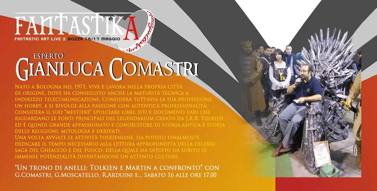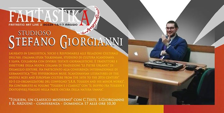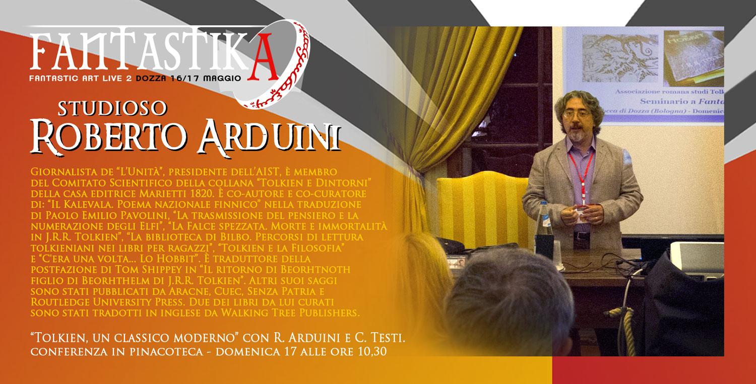 Ancora per l’aspetto artistico torneranno artisti molto conosciuti agli amanti di Tolkien come Andrea Piparo e Maria DiStefano (con una mostra dedicata alla Divina Comedia). SARTORIA: passando al piano nobile della Rocca, alcune stanze ospiteranno l’esposizione Una sartoria nella Terra di Mezzo, con abiti ricamati a mano da Daniela Mastroddi, sarta conosciuta anche all’estero per le sue creazioni artistiche. EDITORIA: per l’editoria tolkieniana, sabato 16 maggio alle 16 Ivan Cavini e Alessio Vissani presenteranno il loro nuovo libro Disegnare e costruire la Terra di Mezzo, che illustra il lavoro da loro svolto negli ultimi anni, pubblicato con il contributo della Fondazione Dozza. CONFERENZE: la domenica sarà invece dedicata all’approfondimento su Tolkien con ben due conferenze: alle 11 in Tolkien, un classico moderno insieme al presidente dell’AisT Roberto Arduini, la guest star di FantastikA per la letteratura, nonché filosofo, studioso e scrittore modenese Claudio Antonio Testi illustrerà il progetto Tolkien e i Classici, in cui l’autore del Signore degli Anelli è stato messo a confronto con molti dei Classici antichi, moderni e contemporanei. Dopo pranzo, invece, Testi terra la sua lectio magistralis: Chi è Tom Bombadil?, che riassume le ricerche dello studioso e propone una soluzione inedita su uno dei personaggi più misteriosi di tutta la Terra di Mezzo.