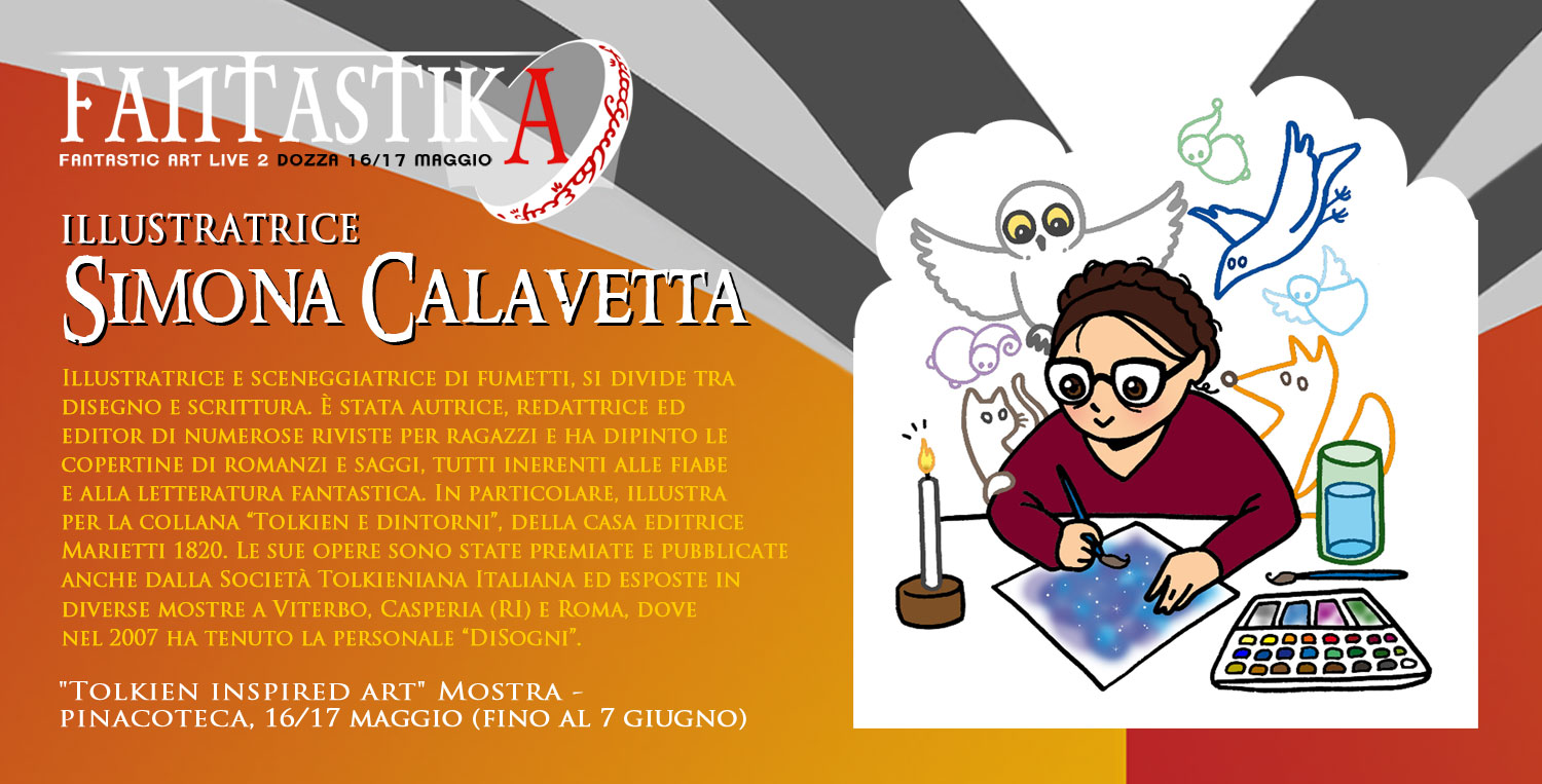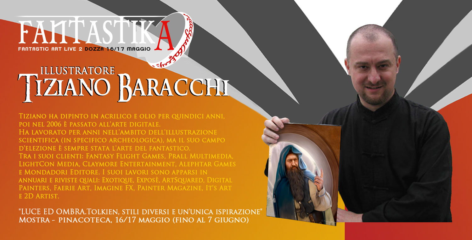 Noto fotografo, ha al suo attivo due libri di reportage fotografici, ha pubblicato su quotidiani nazionali (l’Unità, Avvenire, La Repubblica), è fotografo ufficiale del Greisinger Museum (primo museo in Europa su Tolkien) di Jenins in Svizzera. Altra mostra tolkieniana sarà Luce e Ombra. Tolkien, stili diversi e un’unica ispirazione, in cui esporranno due artisti talentuosi con una lunga esperienza: Simona Calavetta, illustratrice e sceneggiatrice di fumetti, è autrice, redattrice ed editor di numerose riviste per ragazzi e ha dipinto le copertine di romanzi e saggi, tra cui quattro copertine della collana Tolkien e dintorni della casa editrice Marietti. Le sue opere sono state premiate e pubblicate anche dalla Società Tolkieniana Italiana ed esposte in diverse mostre a Viterbo, Casperia (Rieti) e Roma. Accanto a lei, esordisce nel mondo tolkieniano Tiziano Baracchi che dopo quindici anni di dipinti in acrilico e olio, ha scoperto nel 2006 l’arte digitale. L’artista ha trovato negli Usa il meritato successo come ritrattista fantasy per giochi di ruolo e di carte collezionabili, collaborando con Fantasy Flight Games, Prall Multimedia, LightCon Media, Claymore Entertainment, Alephtar Games e Arnoldo Mondadori.