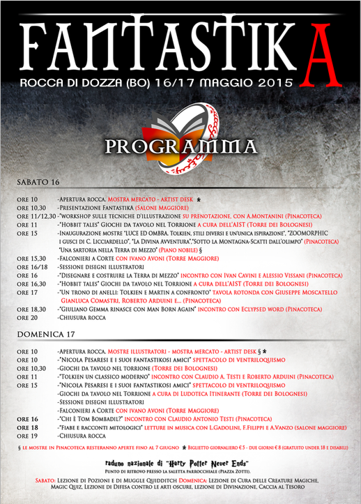 Organizzata dalla Fondazione Dozza Città d’Arte, con il patrocinio del comune di Dozza, dalla nostra Associazione e sotto il coordinamento di Ivan Cavini, artista di fama internazionale e appassionato tolkieniano, quest’anno la manifestazione oltre alla rocca coinvolgerà gran parte del borgo medievale. Sarà quella l’occasione per incontrare quasi tutti i soci dell’AisT: i nostri soci coordineranno molte attività, tutte quelle dedicate a Tolkien, avendo anche la direzione artistica di alcune delle mostre. Sarà l’occasione di conoscere dal vivo nuovi artisti tolkieniani e incontrarne altri già noti e famosi. Sarà l’occasione di ascoltare studiosi seri e affermati in tutto il mondo. Perché FantastikA e l’AisT sono una garanzia di qualità.