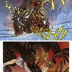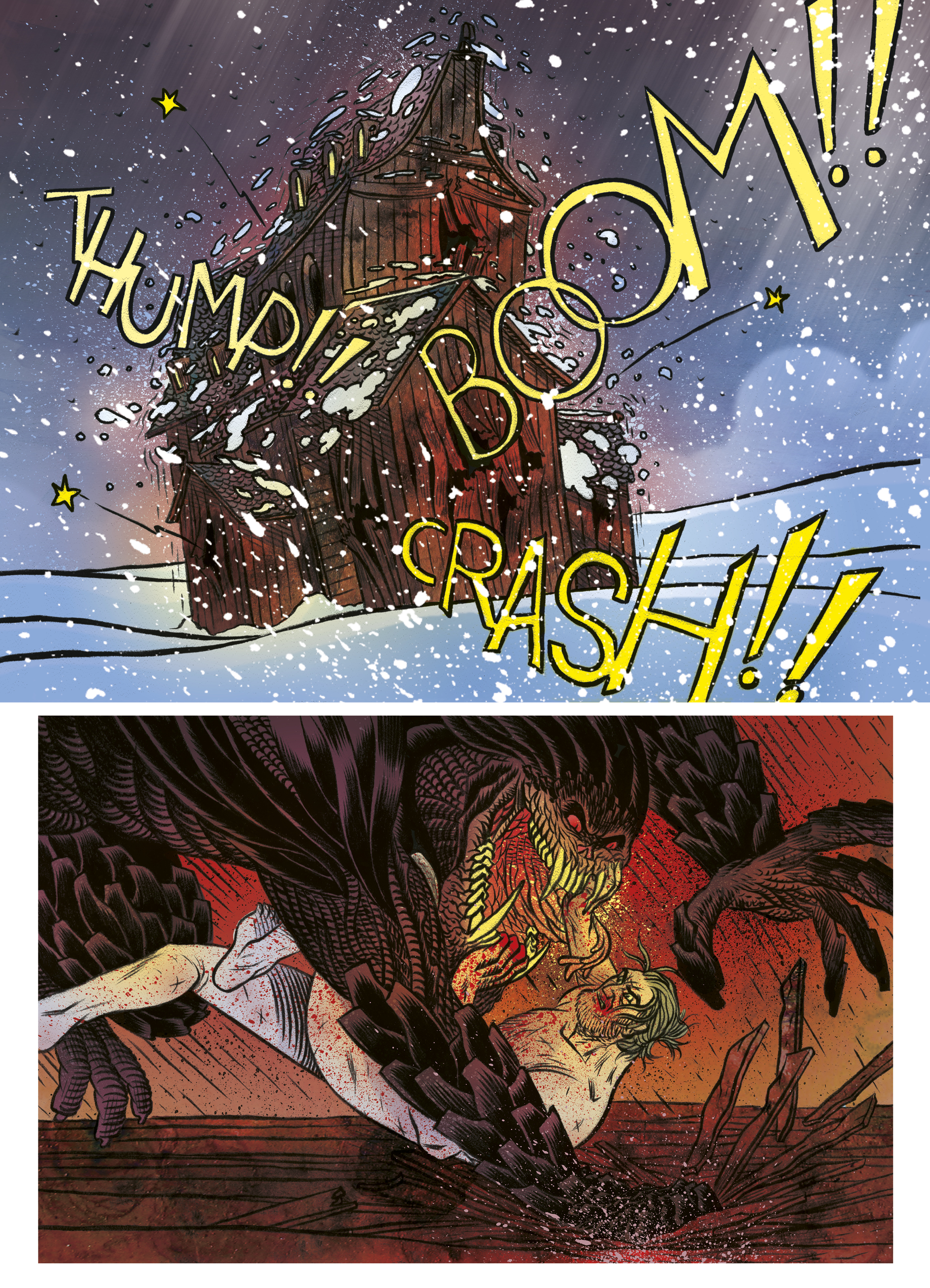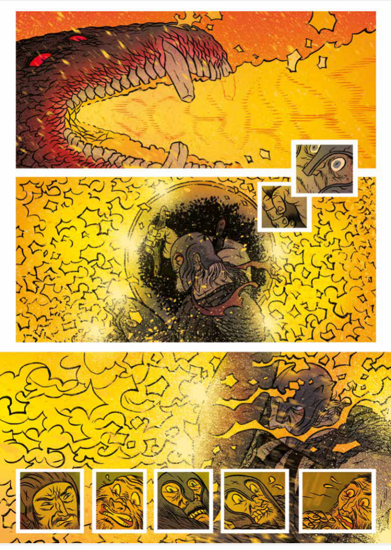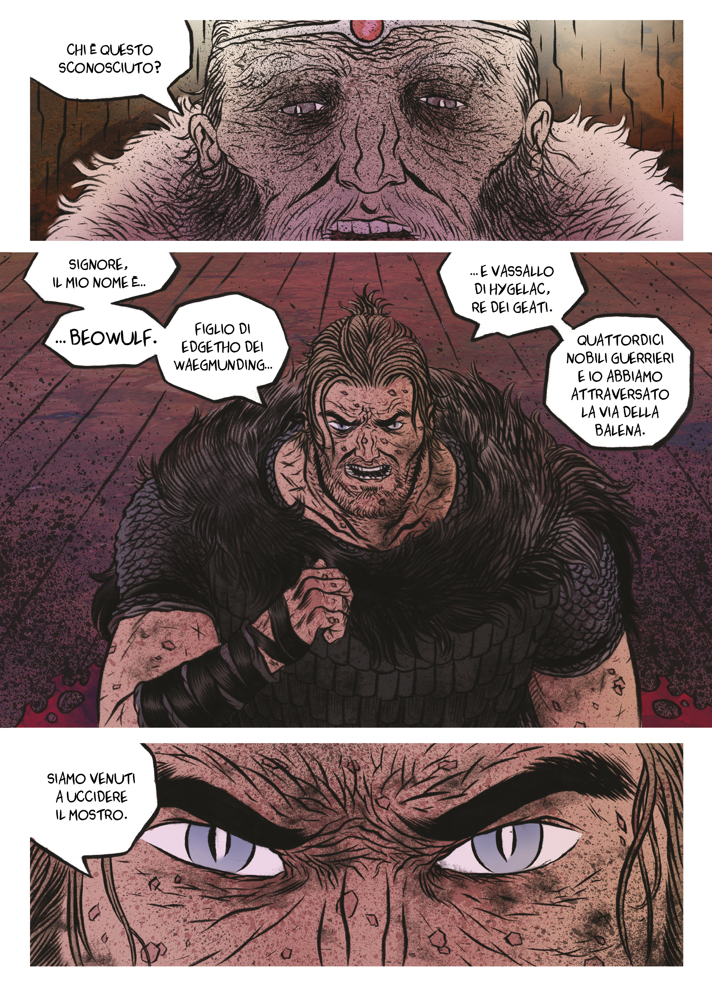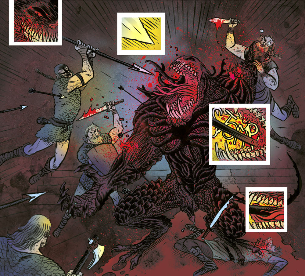 Non si può però non concludere con una riflessione che dà il senso di tutto l’articolo. Beowulf va preso per quello che è: l’eterna dicotomia tra il bene e il male. Per effetto della continua narrazione parallela di eventi scandita dalla frammentazione della tavola, ciò che salta all’occhio del lettore è il forte dualismo tra gloria e miseria, tra passato e presente. Il male, la miseria e la morte sono emblematici anche negli antagonisti – Grendel e sua madre sono discendenti di Caino. Lo stesso drago della parte finale è avido di danaro, ispirando lo stesso Tolkien nella creazione di Smaug nello Hobbit. La fisicità con cui è rappresentata la storia è comune sia agli eroi che ai mostri, tutti sono bramosi di sangue, carne, gloria o ricchezze. Questo accostamento è sottolineato dalle identiche inquadrature che gli autori scelgono per rappresentare prima Grendel, poi lo stesso Beowulf: il punto di vista del lettore è dall’interno della bocca, organo strettamente collegato con la consumazione.