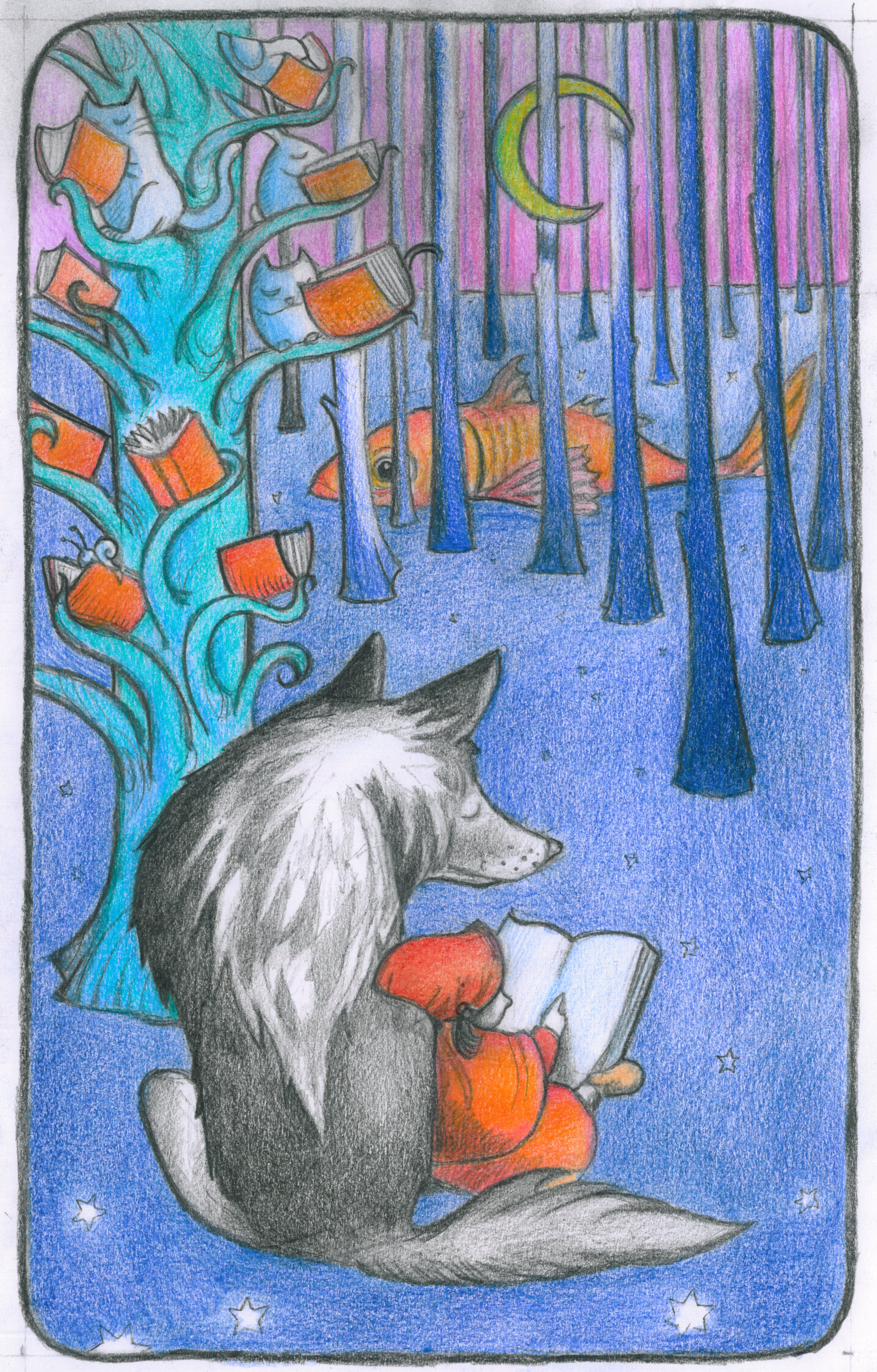 Ed ecco un albero fantastico dà generosamente i suoi frutti (i libri) che sono letti da tanti piccoli animali. Una bimba (vestita come Cappuccetto Rosso che rappresenta tutti i bimbi del mondo). Grazie a questo nutrimento supererà le sue più grandi paure (rappresentate dal Lupo) che diventa docile affettuoso, addirittura protettivo». Perché è così importante il mondo fantastico a cui ti ispiri? «Nella nostra fantasia tutto può accadere, anche le cose più inverosimili: pesci che nuotano nei boschi, le Stelle spuntano nell’erba, la Luna può restar impigliata tra i rami, le situazioni più incredibili possono avverarsi sotto i nostri occhi e se tutto può accadere dentro di noi, anche ciò che ci circonda appare diverso e ci sentiamo più sicuri di affrontare l’incredibile viaggio della nostra Vita».