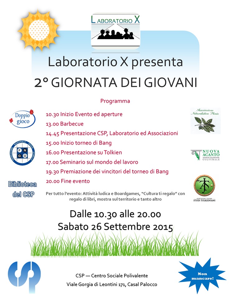 Sono iniziate le attività dell’associazione per il periodo autunnale. E si parte da Roma, dove l’Associazione Italiana Studi Tolkieniani ha l’occasione di presentarsi, contribuendo alla crescita di una manifestazione di periferia che coinvolge molto i giovani appassionati di J.R.R. Tolkien, dei giochi da tavolo e di quelli di ruolo, la IIª Giornata dei Giovani del Laboratorio Decimo, che si terrà dalle 10.30 alle 20.00 di sabato 26 settembre 2015, presso il CSP – Centro Sociale Polivalente di Casal Palocco, a Roma. Sarà una giornata all’insegna delle attività ludiche, con tornei e singoli sfide ai nuovissimi titoli di quest’anno, ma anche con momenti di approfondimento sull’autore del Signore degli Anelli.