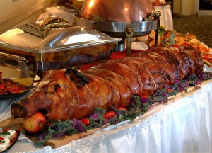 Nel capitolo Relitti e alluvioni gli hobbit offrono come pranzo (tra le altre cose) maiale di prima qualità e pancetta ad Aragorn, Gimli e Legolas. «E non c’è alcun motivo per arricciare il naso di fronte ai cibi, Messer Gimli», vociò Merry. «Questa non è roba da Orchetti, ma mangime umano, come lo chiama Barbalbero. Preferisci vino o birra? C’è un barile di là…. passabile. E questo è maiale salato di primissima qualità; ma se preferite posso farvi alla brace qualche fetta di pancetta. Mi dispiace di non avere verdure: i rifornimenti sono stati interrotti negli ultimi giorni! Non ho altro da offrirvi, per finire, che burro e miele da spalmare sul pane. Vi basta?». «Eccome!», disse Gimli. «Il vostro debito diminuisce notevolmente». I tre compagni furono tosto intenti a mangiare, e i due Hobbit incominciarono spudoratamente un secondo pasto. «Dobbiamo tener compagnia ai nostri ospiti», dissero.