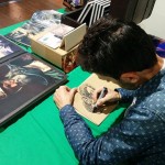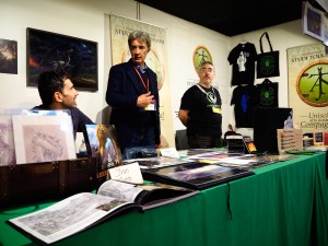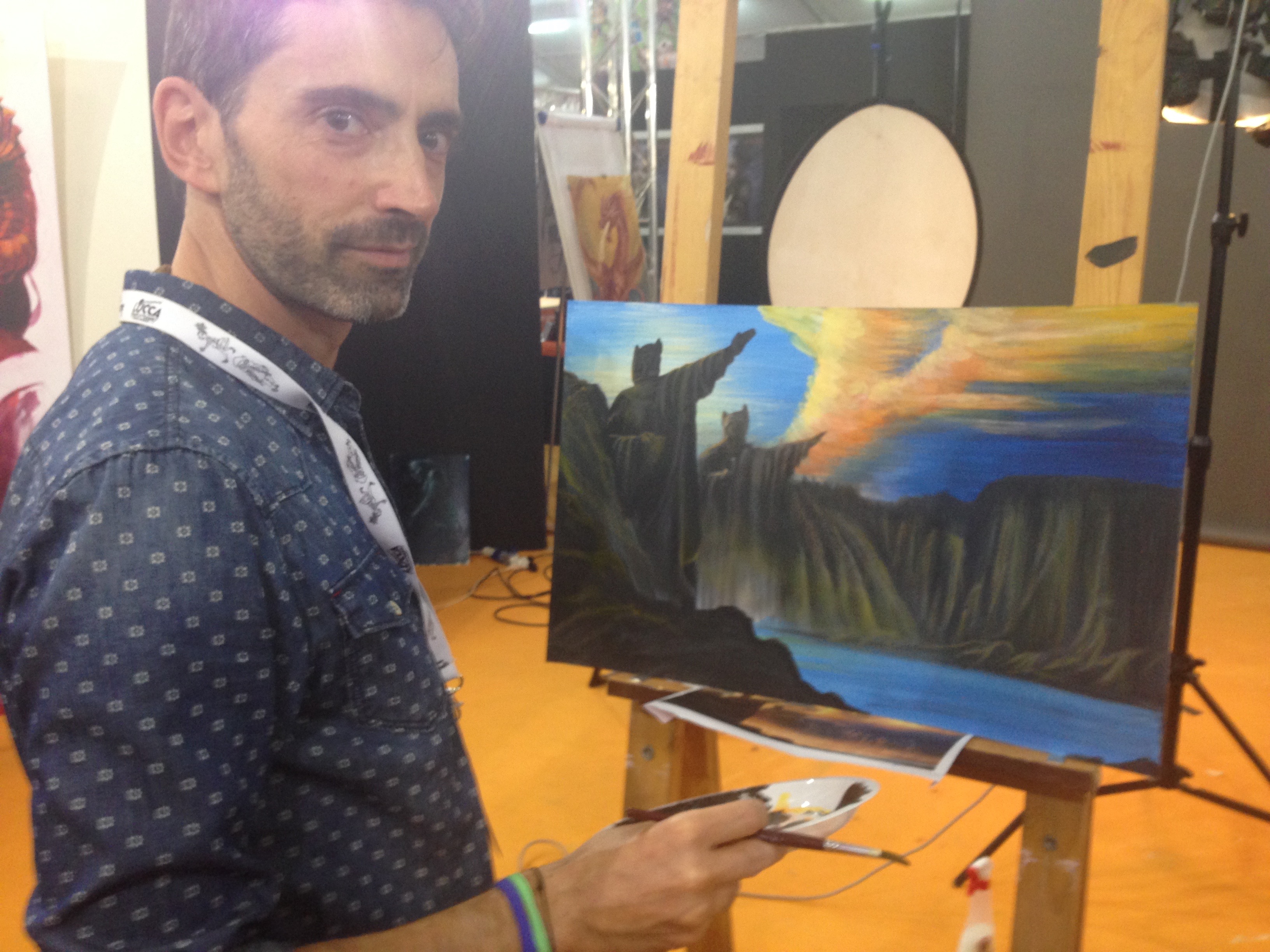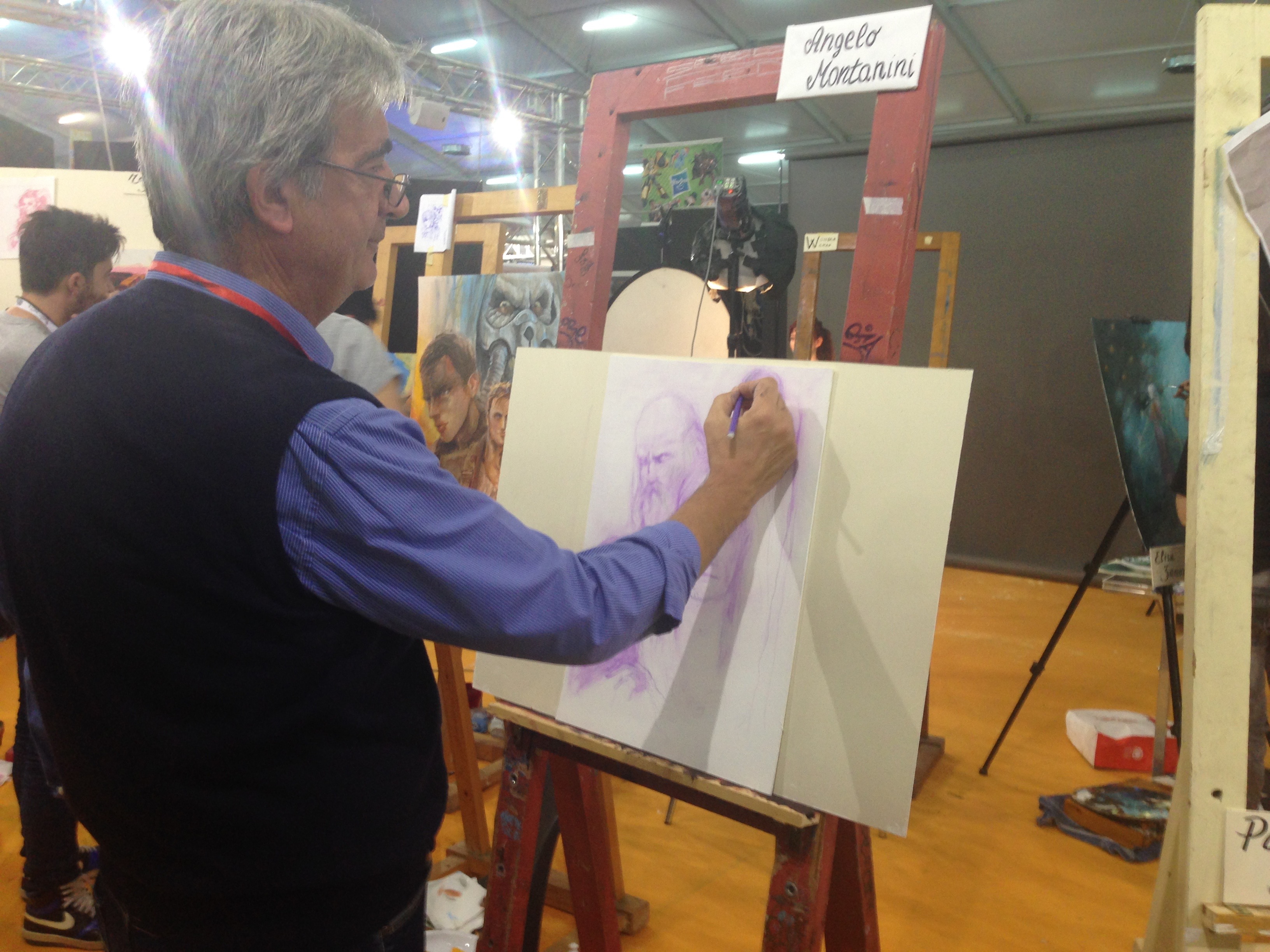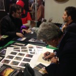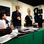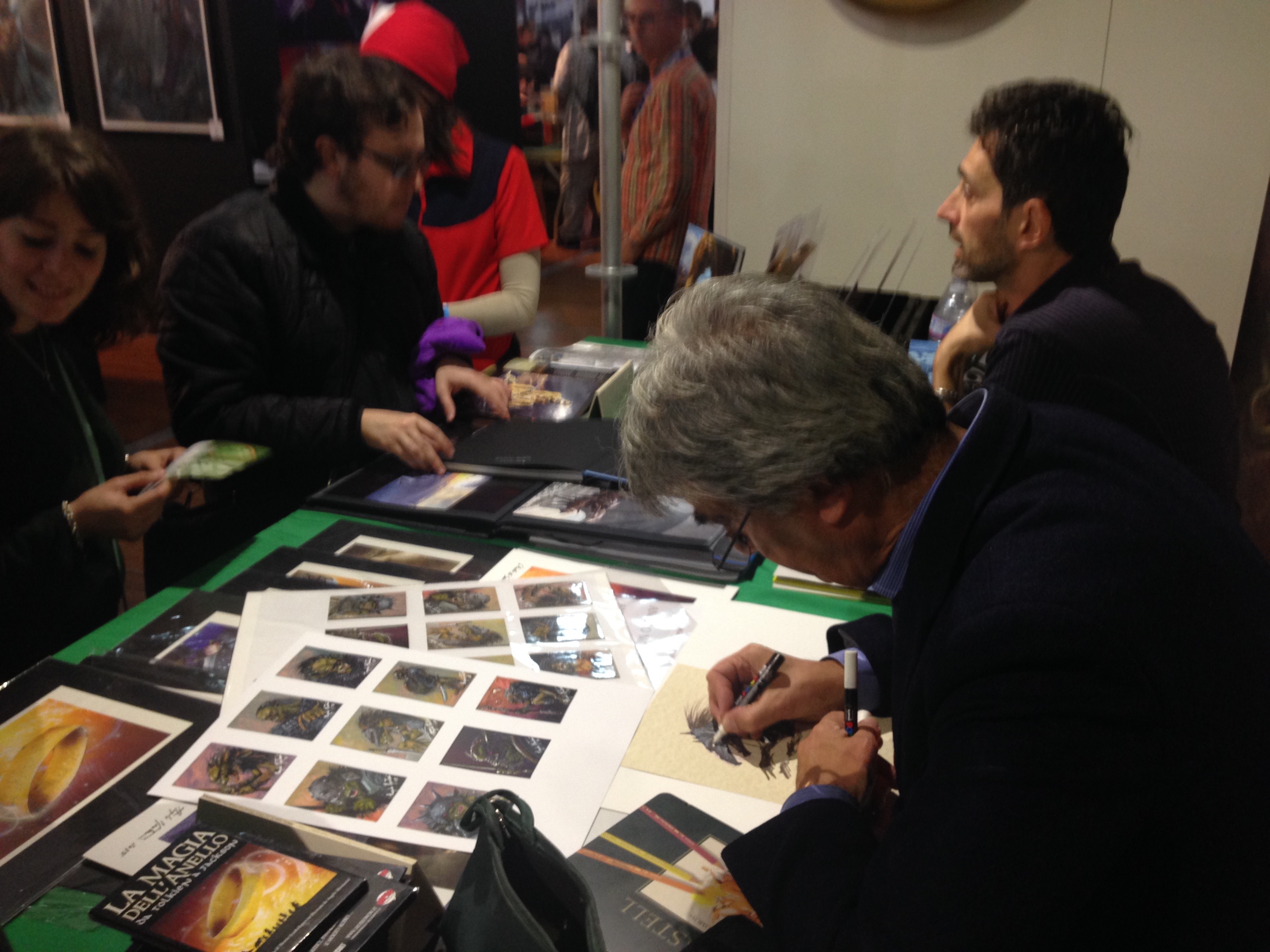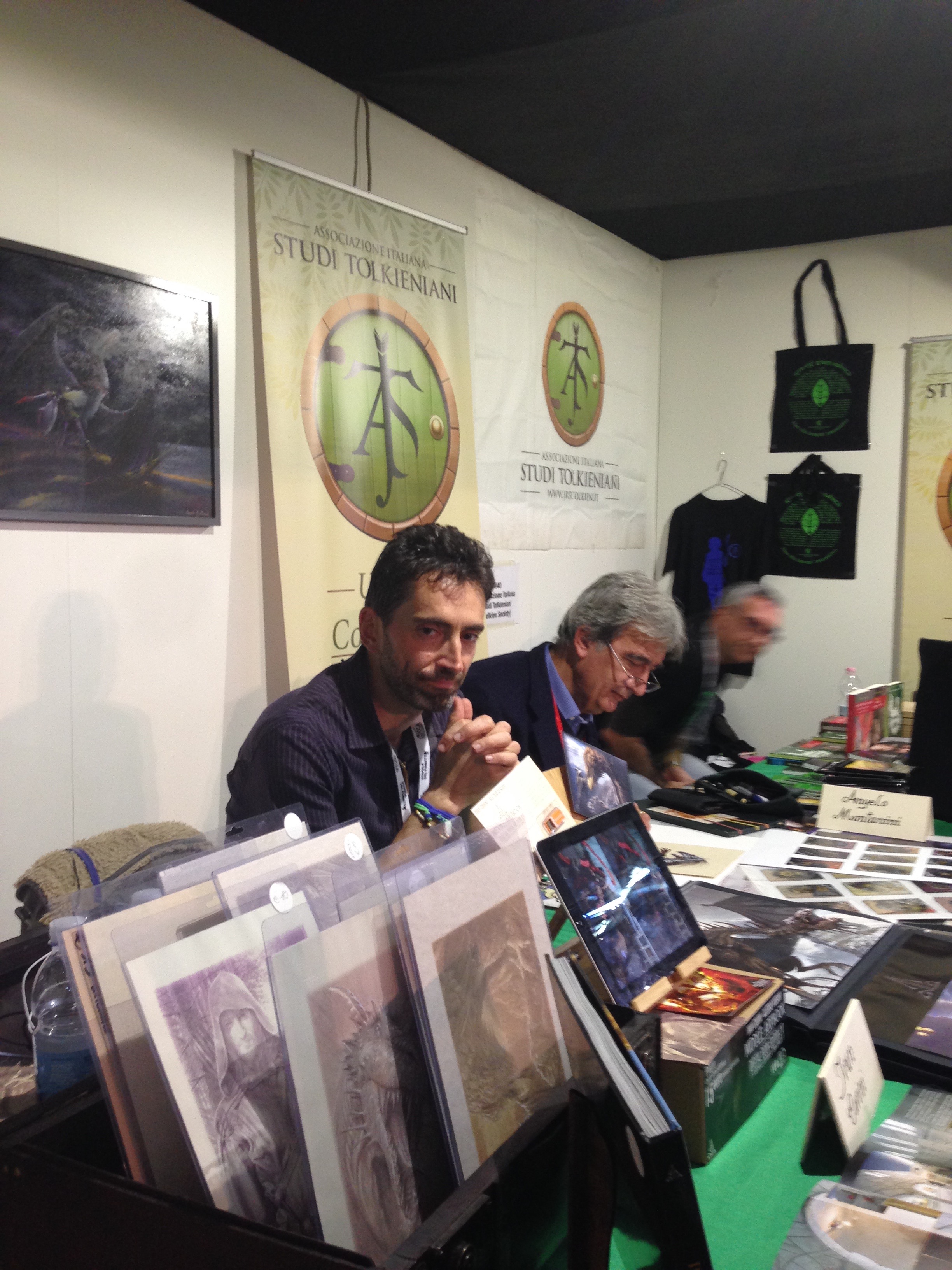 La novità di quest’anno è stato proprio il pubblico degli appassionati, che più volte si è dato appuntamento da noi per parlare e discutere di questioni tolkieniane. Un successo inaspettato è stato poi la pesca dell’Unico Anello, che ha regalato molte soddisfazioni a chi lo ha provato: in molti si sono potuti portare a casa i premi vinti, tra taccuini, cataloghi d’immagini e magliette, tutte dedicate alla Terra di Mezzo. Ma lo stand ha offerto anche due perle preziosissime: la presenza di artisti del calibro di Ivan Cavini e Angelo Montanini, che per 4 giorni hanno disegnato per io migliaio circa di persone che ha affollato quel lato dello stand! Montanini, appena divenuto socio onorario dell’AIST, ha messo in mostra uno splendido quadro di cui scrivere nelle prossime settimane oltre alla serie di immagini dedicata agli Orchetti e goblin.