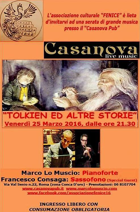 Uno di questi, Marco Lo Muscio, sarà visibile, ma soprattutto ascoltabile, venerdì 25 marzo a Roma, al Casanova pub alle ore 21.30. Lo Muscio è un musicista poliedrico: è nato e vive a Roma, e sul suo sito web si legge che è pianista, organista e compositore, e ha all’attivo più di 700 concerti sparsi per il mondo. Oltre al repertorio classico, si è specializzato in arrangiamenti di Jazz contemporaneo e progressive, giungendo a contatto con grandi artisti del calibro di Rick Wakeman, Keith Emerson, David Jackson, John e Steve Hackett; il suo album “The book of Bilbo and Gandalf”, interamente dedicato a Tolkien, è nato dalla collaborazione con Pär Lindh, Oksana Sinkova, John e Steve Hackett (chitarrista dei Genesis). Di frequente le composizioni di Lomuscio si ispirano al mondo della letteratura (ma non solo), come lui stesso afferma: “Il fantasy è un tipo di letteratura particolare. Già il nome fantasia a noi musicisti dà delle impressioni di per sé, per cui è molto facile scrivere musica con questo tipo di libri. Mi piace scrivere ispirandomi a quadri, a opere d’arte o come in questo caso a libri e sperimentare così le interconnessioni tra varie arti”. La serata del 25 marzo si allinea perfettamente a questa linea di pensiero: promossa e organizzata dall’associazione culturale Fenice, e vedrà Marco Lomuscio al pianoforte e alle tastiere e Francesco Consaga al sassofono. Le musiche saranno prevalentemente ispirate al mondo tolkieniano, ma ci saranno anche altre suggestioni, come indica il programma: