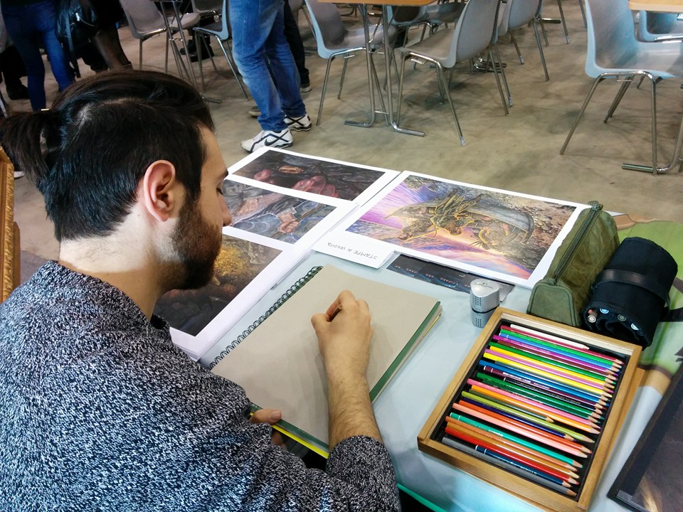 1. Artist desk dell’artista Andrea Piparo , che sarà presente tutti i giorni allo stand per mostrare le sue tecniche di illustrazione ed eseguire disegni a tema tolkieniano su richiesta.