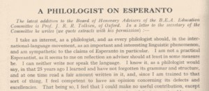 La firma di Tolkien a favore dell’introduzione dell’esperanto nelle scuole – negli anni in cui si batteva per una riforma degli studi linguistici anche all’università – era evidentemente dovuta alla sua fiducia nel fatto che lo studio di un idioma artificiale potesse aprire la mente degli studenti alla riflessione e all’invenzione linguistica, com’era successo a lui.