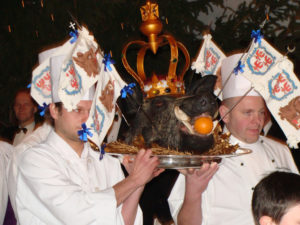Il giorno di Natale una grande testa di cinghiale veniva portata solennemente nella Hall del Queen’s College da tre portatori, posata su un vassoio di argento, decorata con un corona, alloro, rosmarino, vischio e trafitta da varie bandierine. La sua entrata era annunciata da trombe ed i portatori erano accompagnati da un araldo che cantava la carola natalizia Boar’s Head (testa di cinghiale).