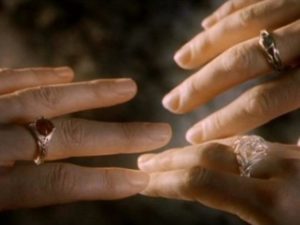 – Narya, l’Anello del Fuoco, con un Rubino, era stato portato da Círdan il quale lo donò a Gandalf con queste parole: “ Questo infatti è l’Anello di Fuoco e con esso potrai riscaldare i cuori in un mondo che diventa sempre più freddo.” (13)