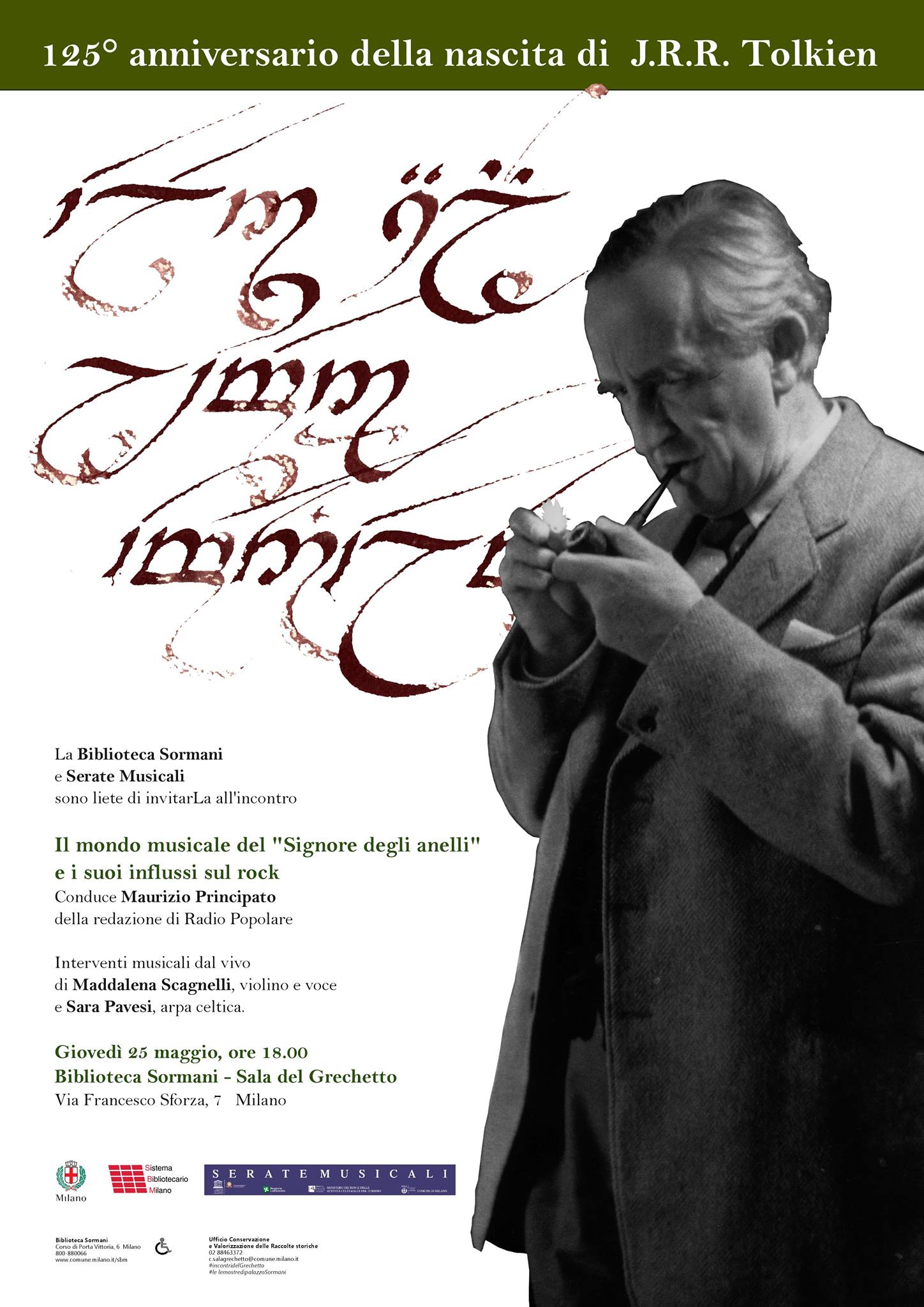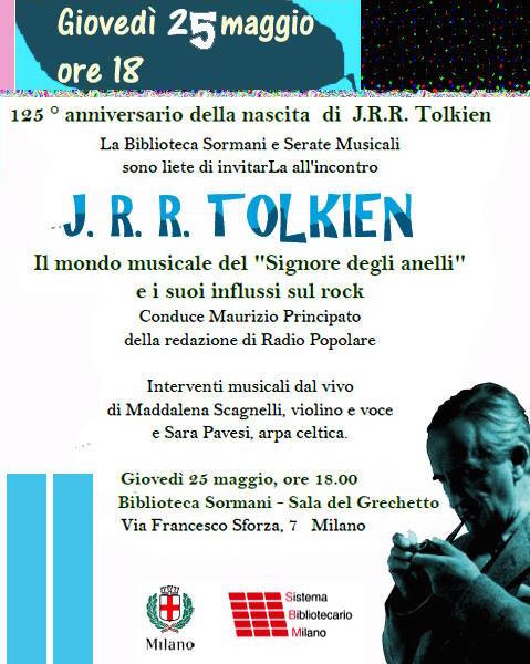 In occasione del 125° anniversario della nascita di J.R.R. Tolkien che si è svolto il 3 gennaio scorso, giovedì 25 maggio, alle ore 18 presso la Sala del Grechetto della Biblioteca Sormani, in via Francesco Sforza 7 a Milano, Il mondo musicale de Il Signore degli anelli e i suoi influssi sul rock. Organizzato da Biblioteca Sormani e Serate Musicali, sarà tenuto da Maurizio Principato, mentre Maddalena Scagnelli (voce – violino e salterio ad arco) e Sara Pavesi (arpa anglica di piccola taglia) faranno rivivere le atmosfere leggendarie eseguendo alcuni brani celeberrimi del repertorio medievale anglosassone e alcune ballate tradizionali nate tra Scozia, Islanda e Irlanda.