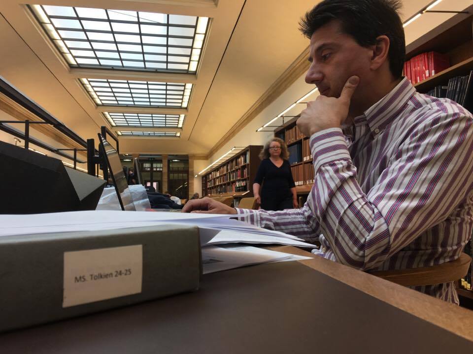 Oxford, ore 9. Siamo già davanti alla Weston Library, per l’ammissione alle parti riservate della Bodleian. «Qualcuno vi ha risposto alla mail?», domanda l’impassibile impiegata dell’ufficio ammissioni. «Siete già stati qui?», è la richiesta successiva. Rispondiamo di sì, abbiamo consultato i manoscritti di Tolkien già nel 2009 e nel 2013. Con mia grande sorpresa, mi stampa subito il tesserino d’accesso, con tanto di fotografia. Per fortuna, sono migliorato rispetto al 2009 e in quella foto sembro più vecchio! La trafila burocratica prosegue ma dopo le scartoffie, si passa direttamente nella sala per il deposito degli effetti personali: per accedere alla sala dei libri rari e dei manoscritti non si può portare nulla, a parte computer e block notes. Non si può neanche mangiare, ma al pian terreno c’è una sala refettorio ben fornita. Saliamo subito al primo piano, impaziente di iniziare il lavoro. Per vedere i libri e i manoscritti abbiamo dovuto prenotarli con due settimane di anticipo, così che oggi sono già qui nella reading room ad attenderci. Questa volta le nostre ricerche sono molto più mirate, Claudio è concentrato sul surrealismo francese, io sul modernismo inglese. Al contrario di quel che si scrive, gli Inklings non erano un gruppo di professori nostalgici di un’età dell’oro che sarebbe dovuta tornare, ma persone ben ancorate al loro secolo, che si tenevano aggiornati, leggevano gli scrittori moderni e ne discutevano, pur avendo posizioni molto diverse tra loro. Ecco, i due le indagini di studio parallele di Claudio e mia si concentrano sugli stessi manoscritti, quelli più teorici: On Faery Stories e A Secret Vice.