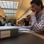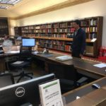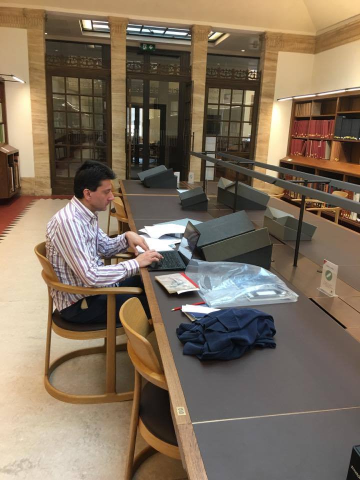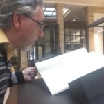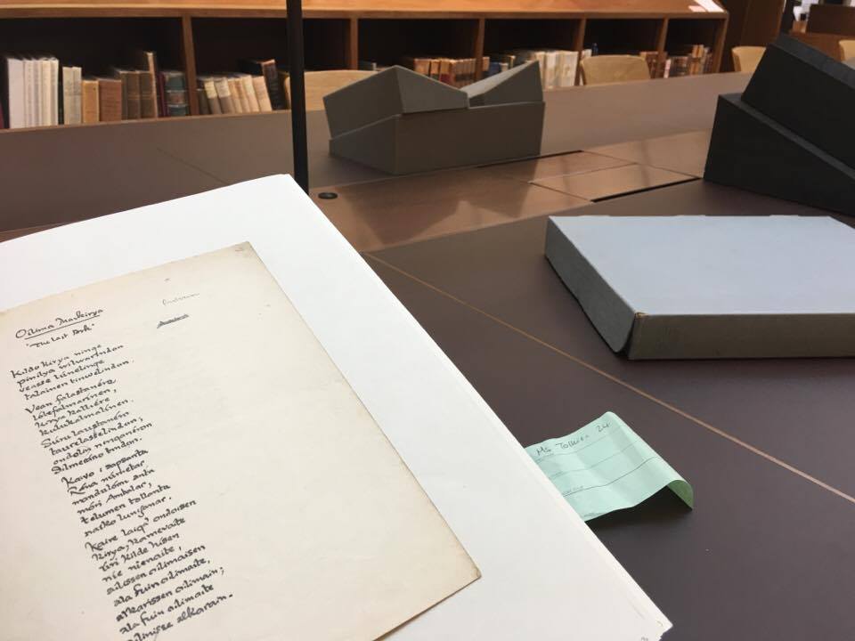 I manoscritti e molti libri della biblioteca personale di Tolkien ci vengono portati dopo un po’ e finalmente ci mettiamo al lavoro. Claudio ha consultato il manoscritto Ms 14 folio 151, tutti erano già stati visti nel 2013, ma stavolta con occhi diversi: contiene la nota e del saggio Sulle Fiabe scritta in autografo. Claudio ha consultato anche alcune pubblicazioni originali del 1936 relative alla celebre mostra surrealista che si tenne a Londra in quell’anno per cercare di capire da quali fonti Tolkien aveva attinto per conoscere il movimento artistico francese. Tra i libri consultati ci sono anche diversi numeri della rivista della Facoltà in cui Tolkien insegnava, con diversi suoi contributi (uno sullo stato dell’arte della filologia nel 1924) ed è curioso scoprire come gli argomenti spaziassero molto, dall’economia alla politica, dalla storia irlandese fino ad arrivare alla scrittura cinese. Proprio sfogliando quest’ultimo mi fa pensare come l’arte della calligrafia cinese abbia affinità con le lingue elfiche…