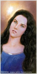 Ella prese una gemma bianca come una stella che pendeva sul suo petto da una catena d’argento, e la mise al collo di Frodo. “Quando ti sentirai turbato dal ricordo della paura e dell’oscurità”, ella disse, “questo ti sarà di aiuto”.