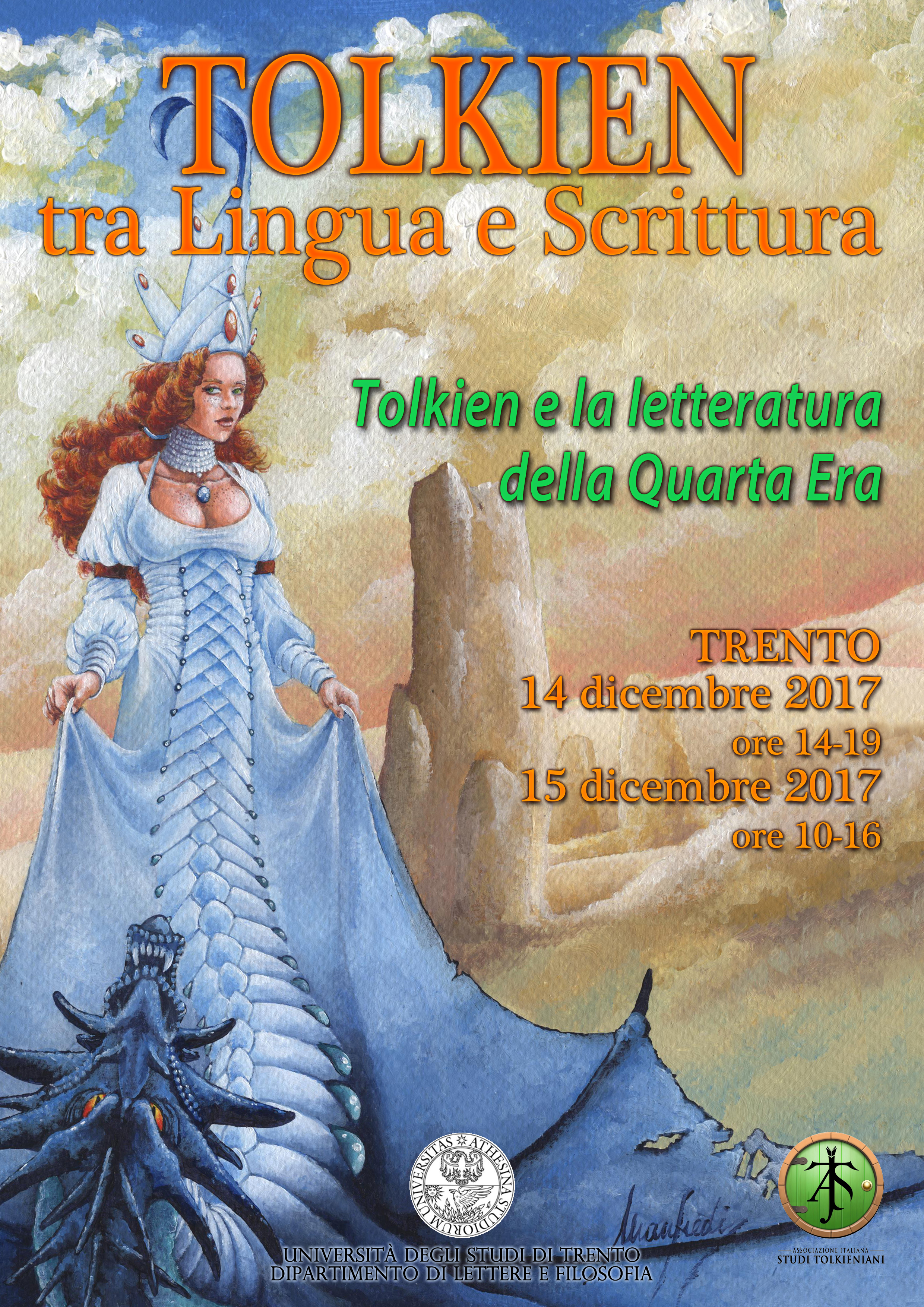 «Nessuno mi crede quando dico che il mio lungo libro è un tentativo di creare un mondo in cui una forma di linguaggio accettabile dal mio personale senso estetico possa sembrare reale. Ma è vero» (Lettere, n. 205). Per Tolkien veniva prima la parola, la lingua e poi la storia, le storie meravigliose che andranno poi a comporre Il Silmarillion e tutto il legendarium (raccolto nella collana della History of Middle-earth) su cui si fondano le opere più conosciute come Il Signore degli Anelli. Il “vizio segreto” di Tolkien, come lui chiamava il suo creare lingue, sarà al centro dell’intervento di Fulvio Ferrari (direttore del Dipartimento di Lettere e Filosofia dell’Università di Trento), durante il quale mostrerà come Tolkien abbia creato il suo universo letterario a partire dai suoi interessi di filologo, linguista e medievista. In particolare verrà messo in luce il complesso gioco tra lingue storiche, lingue inventate e inglese moderno, sottolineando come Tolkien usi il concetto stesso di traduzione per realizzare il suo progetto di “nuova mitologia”. Il contributo di Fulvio Ferrari aprirà il convegno, occupando la mattinata, mentre nel pomeriggio seguiranno gli interventi di Federico Gobbo, professore di interlinguistica ed esperanto presso l’università di Amsterdam, e Leo Carruthers, Professore