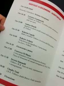 Dopo i saluti di rito da parte di Fulvio Ferrari, direttore del Dipartimento di Lettere e Filosofia e socio AIST, Lorenzo Gammarelli ha aperto il convegno con l’intervento “Tolkien on Tolkien”, analizzando i passi dove Tolkien stesso parla delle sue opere direttamente o indirettamente, come in Foglia di Niggle, Il Fabbro di Wootton Major o le Lettere (quest’ultime disponibili dal 3 gennaio in una nuova traduzione proprio ad opera di Gammarelli). Accanto ai commenti di Tolkien sul sé stesso passato, come se stesse parlando di un altro autore, troviamo la ferma negazione di alcuna chiave di lettura allegorica del Signore degli Anelli o le raccomandazioni alla casa editrice Allen&Unwin sulle differenze presenti in nuce tra Lo Hobbit e il suo prosieguo.