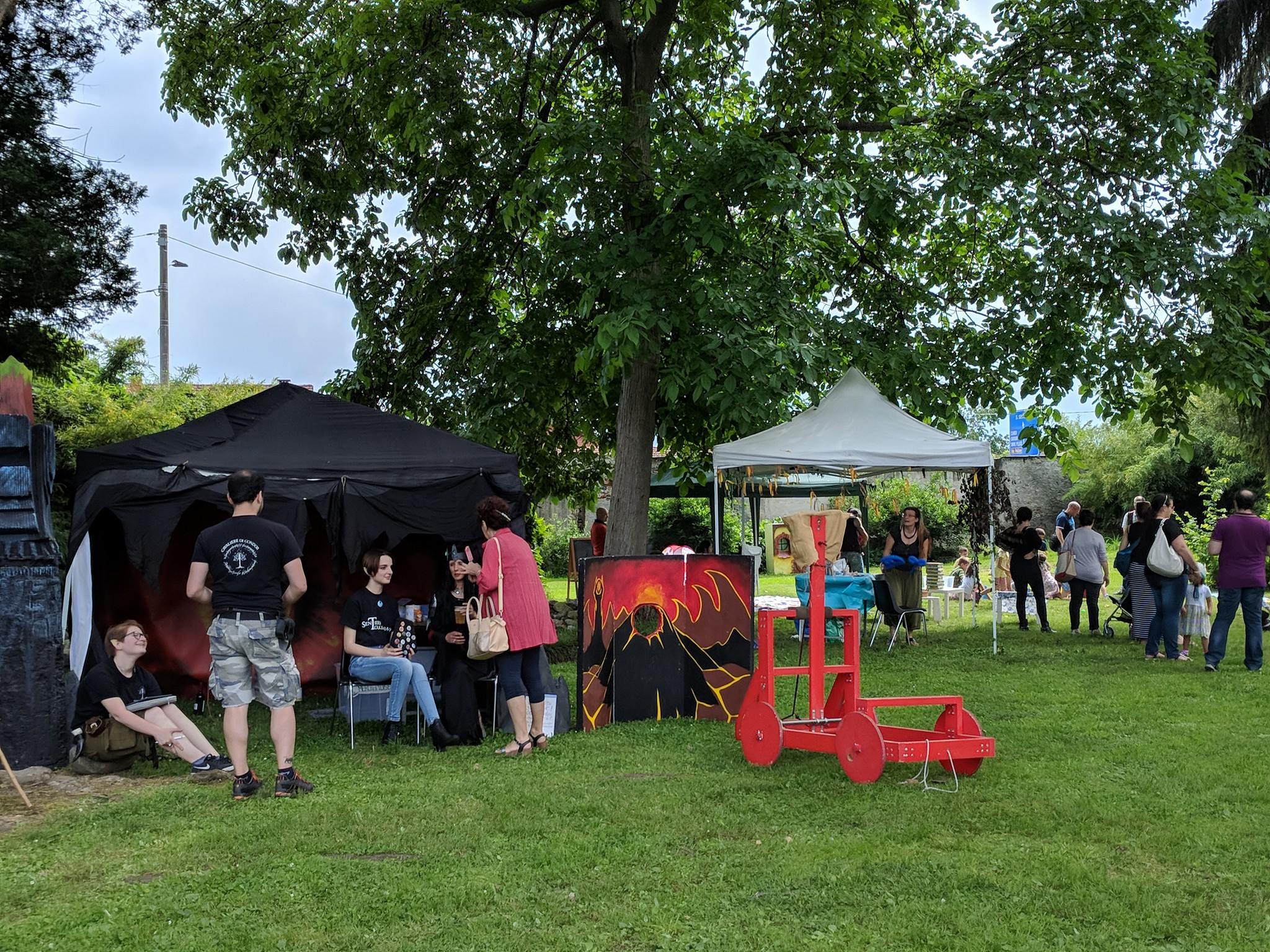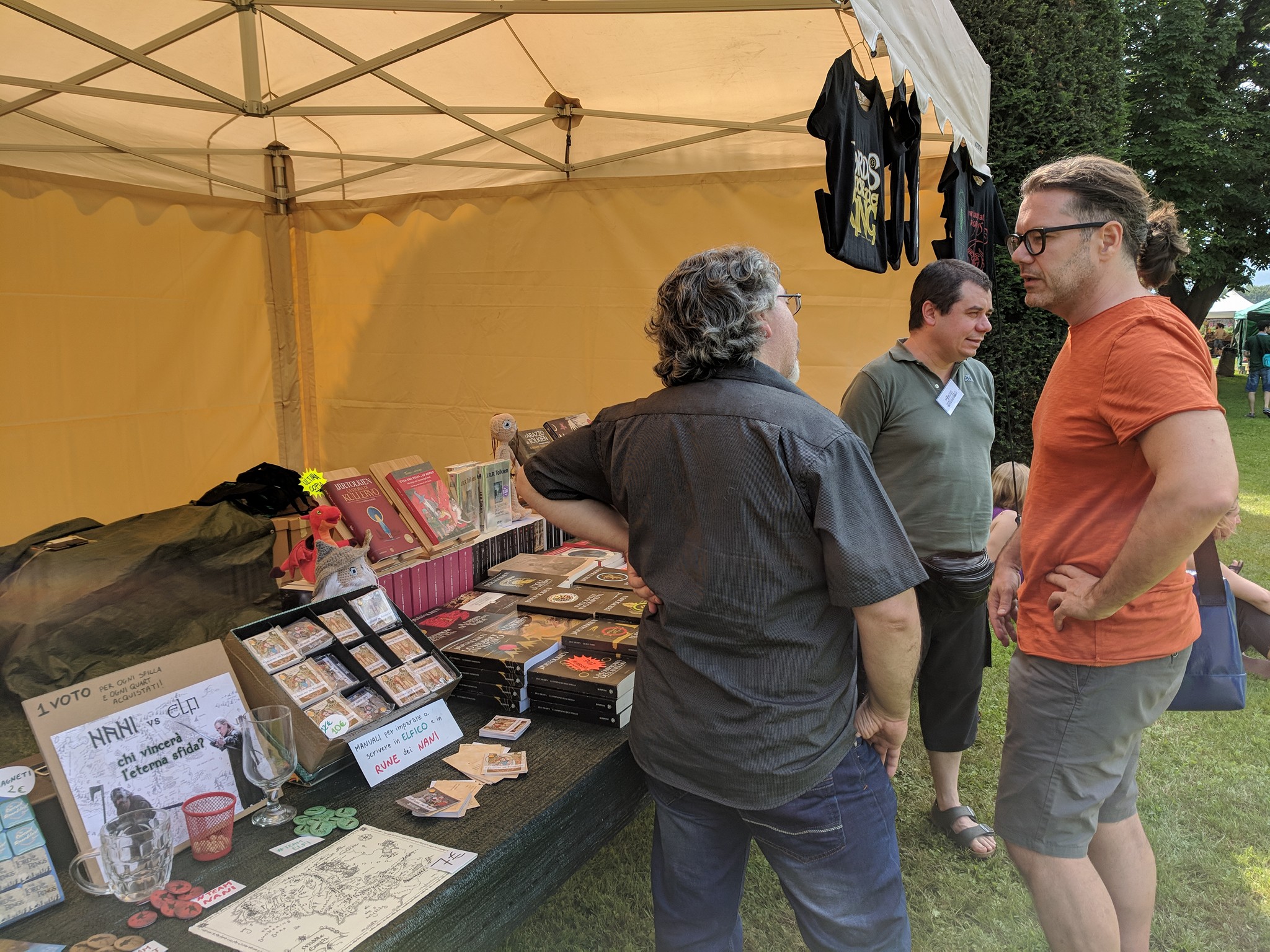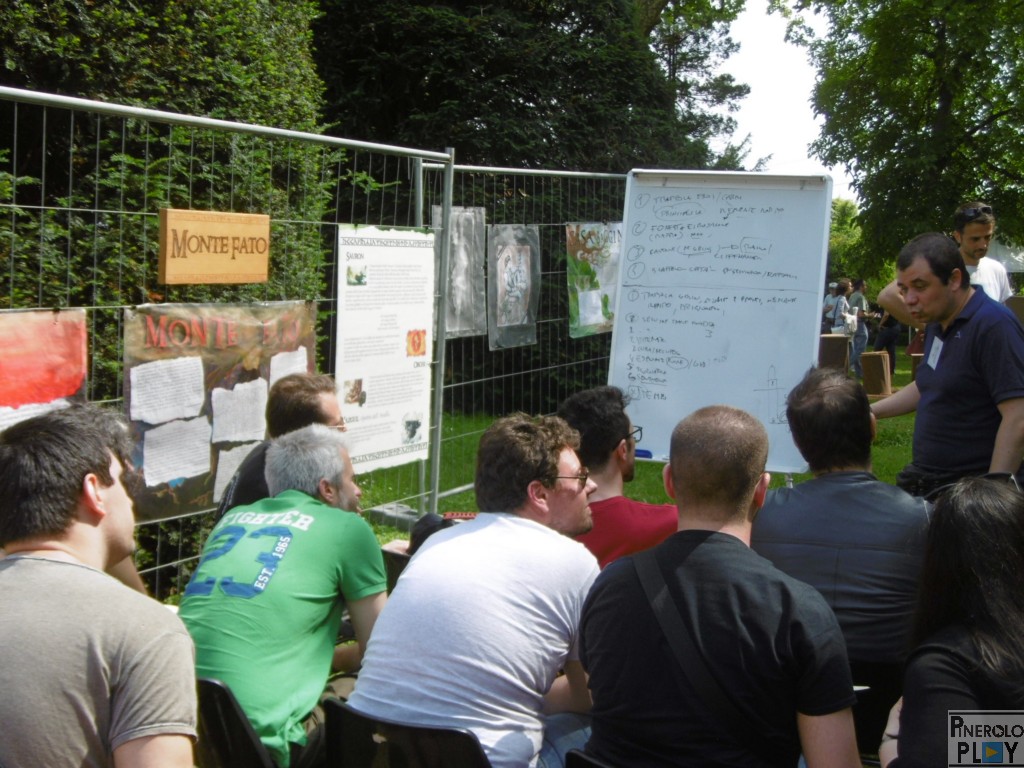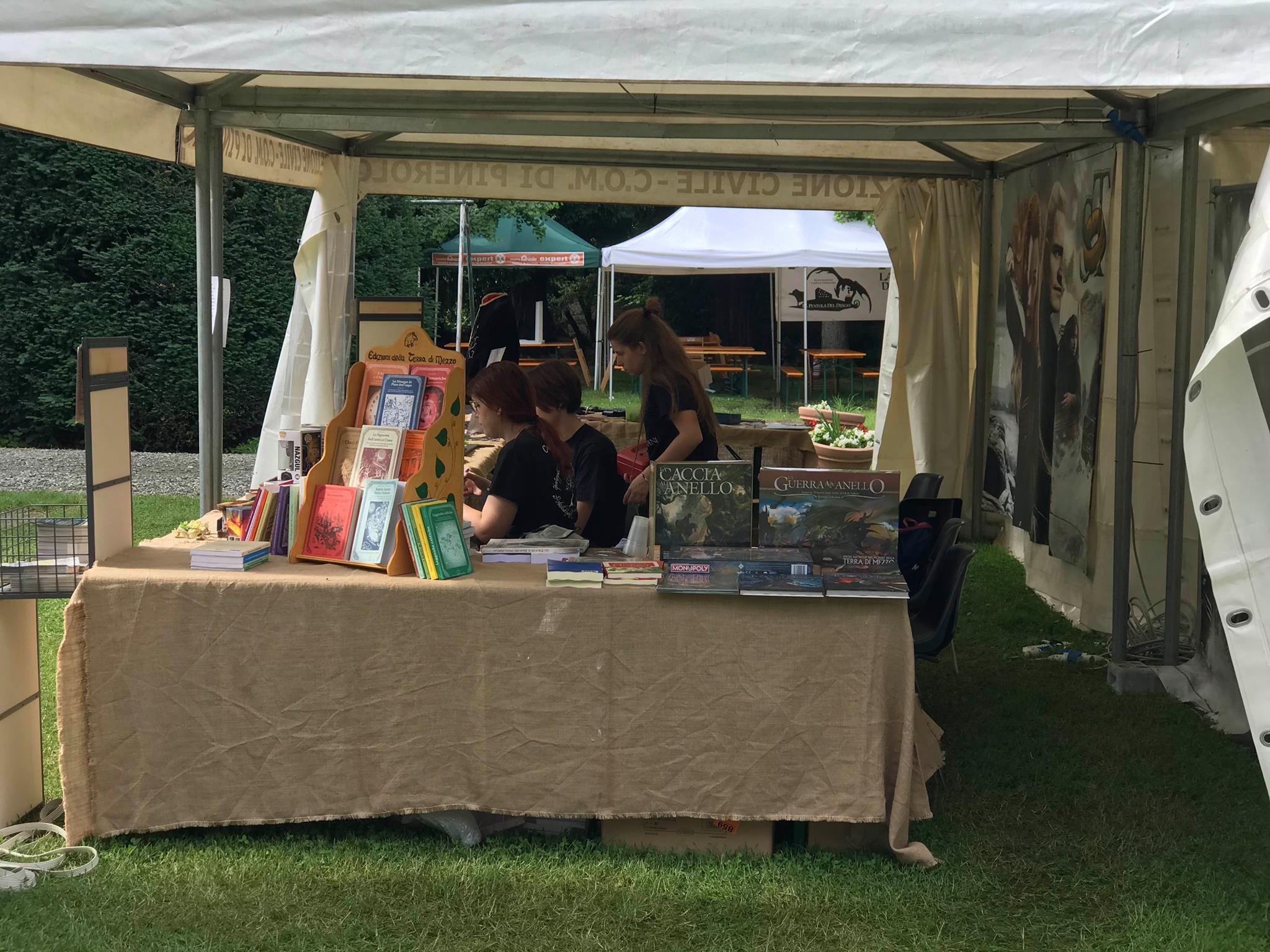 A chiudere quel lato c’era l’area conferenze (Granburrone), allestita in maniera magistrale con un gazebo di forma ottagonale che ospitava la postazione di Radio Brea e quella dei relatori, fronteggiata da numerose file di sedie per il pubblico. Proprio qui stazionava tutto il gruppo che fa capo ad Andrea Gilby Giliberto, Silent Bob, Manuel Marras, e in cui si sono alternati tutti i relatori, tra cui spiccavano Paolo Gulisano, Luisa Paglieri, Chiara Nejrotti, Barbara Sanguineti, Renzo Caimotto e Matteo Coero Borga. Mentre sull’opposto lato lungo c’eravamo noi con altri stand associativi, il lato più lontano dal castello era dedicato al mercatino tematico (la Fiera di Brea), composto da più di 40 stand, accuratamente selezionati con opere artigianali molto particolari e di ogni tipo, che ha permesso al pubblico di avere un ricordo unico della manifestazione.
