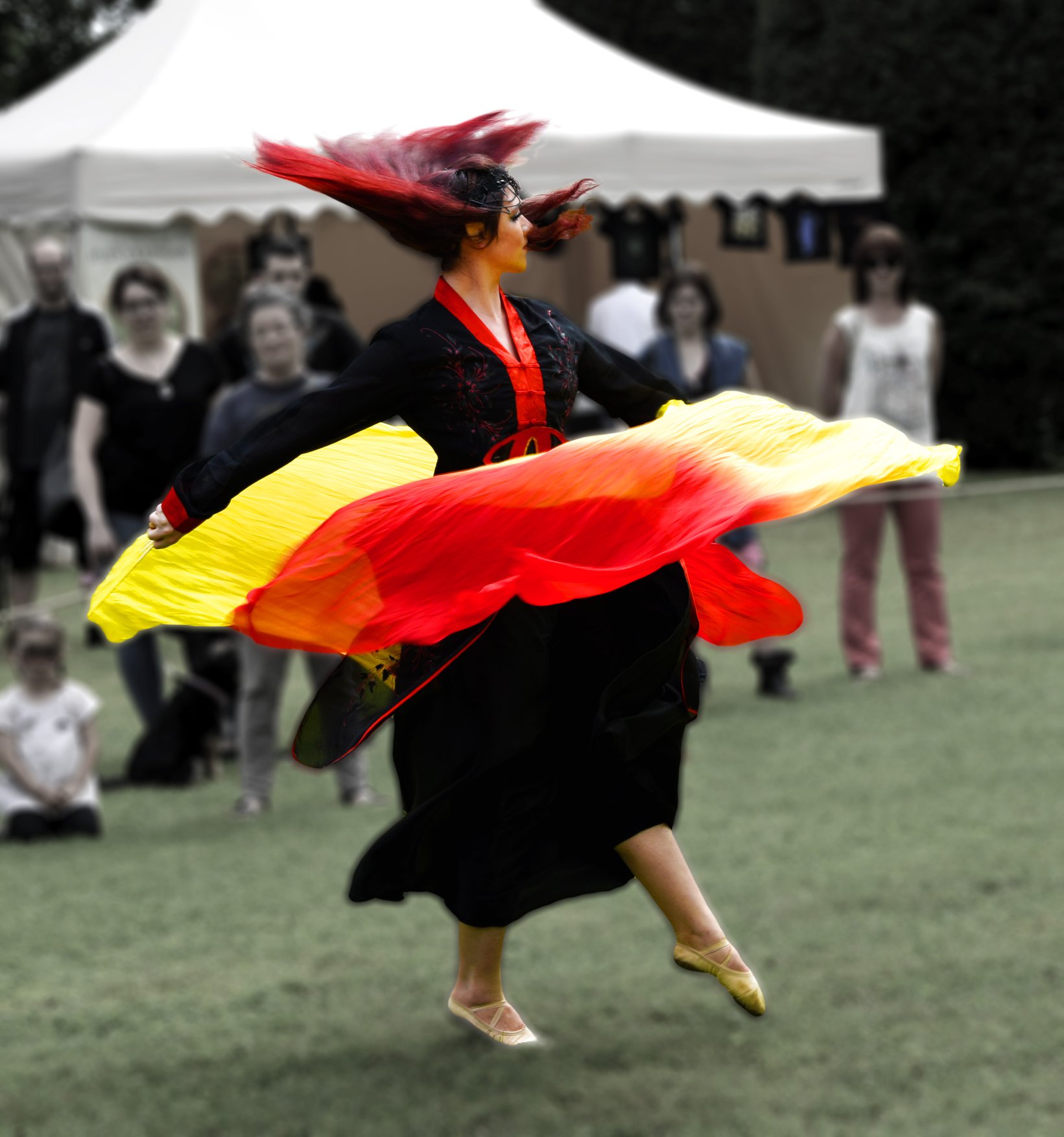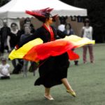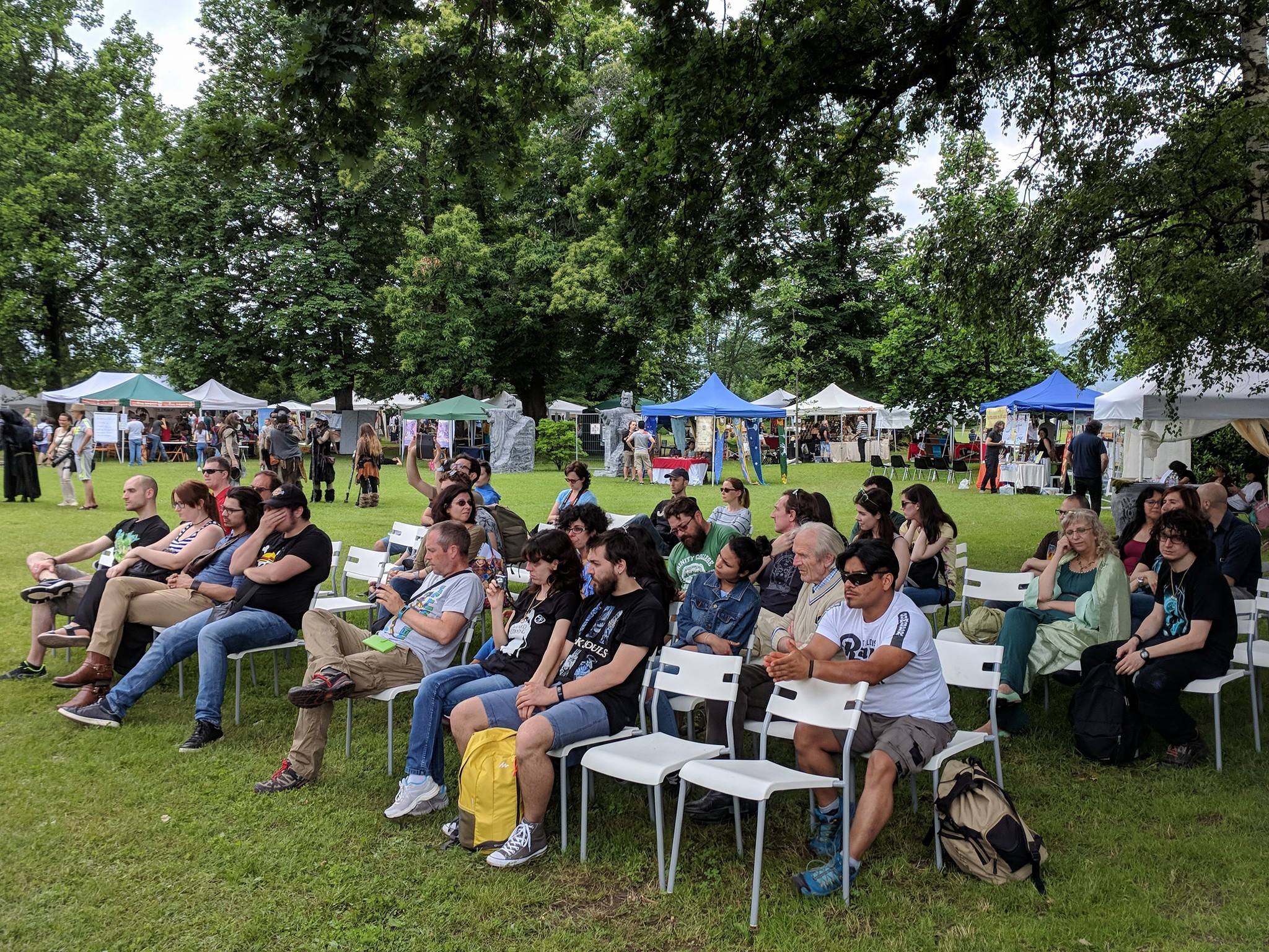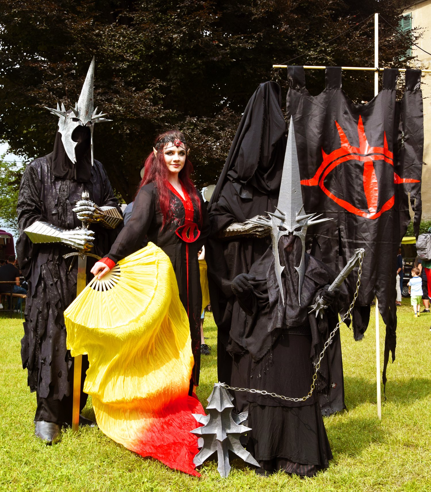 Ecco, al centro di tutto questo lo staff è riuscito a realizzare una piccola e perfetta Contea, come quella degli Hobbit, con tanto di percorso tematico in tutta la Terra di Mezzo che ha avuto il suo Gandalf nel professor Daniele Ormezzano, ottima guida nei numerosi tour per i visitatori che si sono svolti nei due giorni. Tutti i tour partivano dall’info point (denominato I Porti Grigi), un grande stand che accoglieva il pubblico appena entrato nel giardino. È stato questo uno dei punti nevralgici della manifestazione, luogo cardine per il coordinamento delle attività e punto di raccolta di tutto lo staff, tra cui spiccava l’efficiente Miriam Policastro. Da lì partiva il sentiero di sinistra che, costeggiando tutto il lato del parco, presentava in ordine l’area bambini (Casa Baggins) gestita al meglio dall’Associazione I Birichini, l’enorme area games (Osgiliath) animata ininterrottamente dalle associazioni ludiche La Pentola Del Drago, La Gilda del Grifone, Dimensione Arcana e la community online Sesso Droga e D&D. Qui erano presenti due ospiti d’eccezione, gli autori di giochi Umberto Pignatelli e Francesco Nepitello, che poi la domenica hanno tenuto una tavola rotonda e un workshop. Girando a destra dall’info point, invece, si entrava in un enorme campo erboso con al centro l’area esibizioni (I campi del Pelennor), dove tra gli altri l’artista Eleonora Burzio si è esibita in 5 danze tutte a tema Tolkien, tutte coreografate da lei: “Beren e Luthien”, “Danza di Tauriel con i pugnali-spada” , “L’inganno di Sauron”, “Anìron” e “Io ti penso amore”, quest’ultime due impersonando Elwing (tutte le danze si possono vedere sul profilo FB dell’artista). L’area era circondata dal palco concerti, dall’area ristoro (Il Puledro Impennato) che permetteva al pubblico di riposarsi all’ombra addirittura di Telperion e Laurelin, magici alla sera con le loro luci fredda e calda!