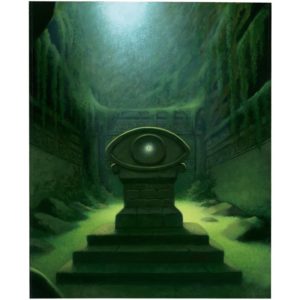 “L’ampia sala era con ogni probabilità l’antico luogo di culto, il cui tetto era sparito, rimpiazzato dall’edera e dai rami nodosi degli alberi. Al centro troneggiava un immenso occhio di pietra che ci fissava. In mezzo all’iride era incastonato un piccolo cerchio di metallo brillante, impossibile da rimuovere.”