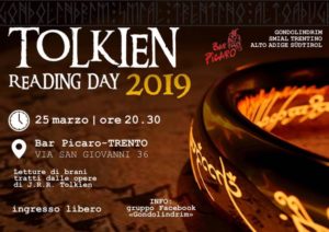 Il 22 febbraio, poi, il gruppo di appassionati si è incontrato per la prima volta al Temple Bar in piazza Domenicani a Bolzano. In quell’occasione è stato scelto il nome e il logo dello smial. Seguendo l’alternanza, il secondo appuntamento si è tenuto a Trento. Il 25 marzo scorso presso il Bar Picaro, in via San Giovanni, più di venti appassionati di Tolkien si sono dedicate alle letture delle sue opere per celebrare il Tolkien Reading Day 2019, con anche l’accompagnamento musicale dell’artista Carmelo. Un bel modo di inaugurare uno smial!