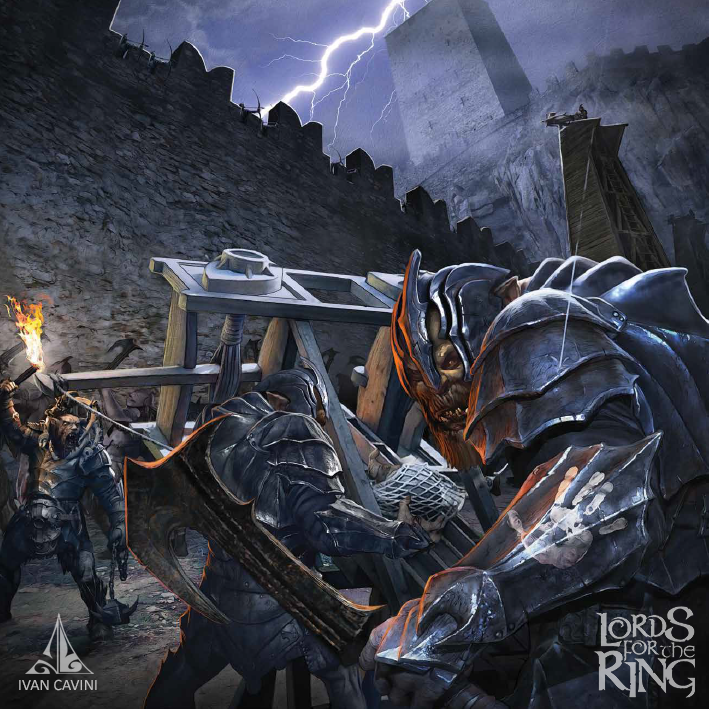 “Un’illustrazione in soggettiva, dalla parte dei villain. Un fulmine illumina il momento che precede lo scontro e notiamo i dettagli delle armature con la “S” runica scolpita sull’elmo e la mano bianca dipinta sui piccoli scudi. L’atmosfera è carica di tensione: sugli spalti i guerrieri di Rohan incoccano le frecce, mentre a terra si armano le balliste, gli uruk-hai vengono incitati allo scontro e può bastare anche solo la prima goccia di pioggia per scatenare la furia dell’assalto.”