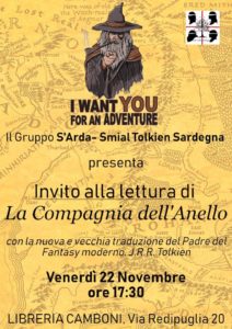 Nel mese in cui è stata pubblicata la nuova traduzione de Il Signore degli Anelli, con l’uscita del primo volume La Compagnia dell’Anello, non poteva non esserci un approfondimento da parte dei lettori appassionati (Le Due Torri e Il Ritorno del Re, invece, sono previsti rispettivamente per la primavera e l’autunno 2020). L’appuntamento è per venerdì 22 novembre 2019 dalle ore 17:30 alle 19:30 presso la libreria Camboni, in via Redipuglia 18-20, a Cagliari. L’ingresso gratuito e tutti gli appassionati di Tolkien sono invitati all’incontro condotto dai membri di S’ARDA- Smial Tolkien Sardegna. È previsto prima un breve discorso di introduzione sull’autore, e poi verranno letti brani sia dalla vecchia che dalla nuova traduzione con un commento finale. L’intento è quello di coinvolgere anche il pubblico: i lettori saranno invitati a dire la loro se vogliono commentare i brani scelti. Verrà anche fatto un confronto tra vecchia e nuova traduzione della poesia di Tom Bombadil e quella di Eldamar; probabilmente si riuscirà anche a far sentire le versioni originali. Lo spirito è quello della condivisione della novità con il rispetto dovuto alla tradizione. Insieme ad Elena Sanna condurrà l’evento Antonio Fudo Sessini. Lo smial vi aspetta numerosi!!!