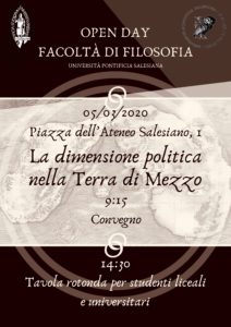 che si interrogano sulla loro scelta universitaria e stanno valutando la Facoltà di Filosofia. Il convegno si terrà dalle ore 9.15 alle ore 13.00, dopo il quale seguirà una tavola rotonda aperta anche agli studenti a partire dalle 14:30. Gli studenti potranno partecipare attivamente, in maniera gratuita e libera all’evento che avrà, oltre alla parte di convegno che si svolgerà in mattinata, anche una tavola rotonda fuori orario scolastico, alle 14:30. L’Università rilascia un attestato di partecipazione agli studenti, valido ai fini del credito formativo a partire dalle classi III. Il convegno è però aperto a chiunque abbia piacere ad unirsi, come dicono gli organizzatori, per passeggiare nella Terra di Mezzo alla ricerca di suggestioni per un cammino politico nella nostra di Terra.