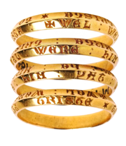Gli anelli erano, e sono tutt’ora, un regalo molto diffuso. Basti pensare all’usanza dei re di regalare anelli. Nel poema epico Beowulf40, gli anelli venivano donati dal Signore di Heorot, re Hrotgar, ai suoi vassalli e ai prodi guerrieri che compivano nobili e coraggiose imprese. In tempi più recenti, nel 1981, la British Royal Legion inviò alla Regina Elisabetta di Inghilterra una nuova pepita da 36 grammi di oro gallese 21 carati, che lei poi regalò nel 2011 al nipote William per il matrimonio con Kate Middleton41 , da cui sono state ricavate le fedi, come da tradizione42. Fra il 1200 e il 1500 della nostra era, donare un anello significava amare una persona o serviva a cementare relazioni sociali43.