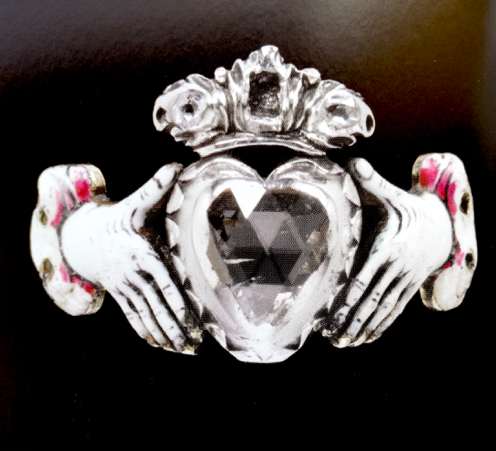 “Il castone a cuore offerto da due mani poste intorno, caratterizza il fede ring uno dei generi più fortunati di anelli. Il fede ring, modellato in Inghilterra dagli orafi Fletcher e Knight fra 1820 e 1830, si ispira a modelli seicenteschi e settecenteschi, come quelli tuttora conservati al Victoria and Albert Museum. Il significato delle mani che porgono