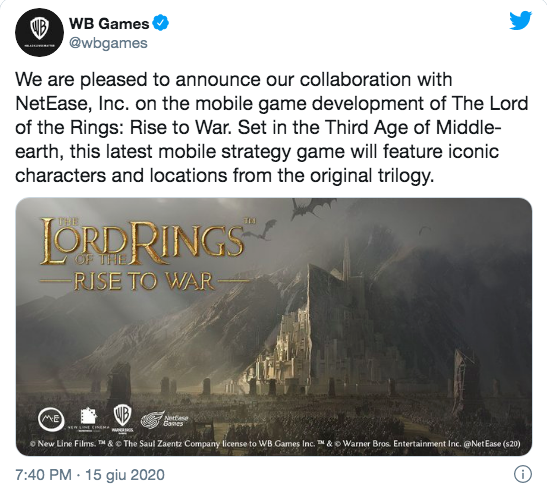 Warner Bros. Interactive Entertainment e NetEase Games hanno da poco annunciato un nuovo titolo mobile dedicato al Signore Degli Anelli. Il Signore Degli Anelli: Rise to War sarà basato sui libri di J.R.R. Tolkien. «Il gioco punta a ricreare il mondo fantastico di Arda, con panorami mozzafiato e una resa fedele, con personaggi iconici e location della trilogia», è la descrizione del gioco. Al momento non si ha idea di che tipo di videogioco sarà, perché Warner Bros. Interactive Entertainment ha solo annunciato lo sviluppo di questo gioco per cellulare con la frase riportata in un post riportato qui a fianco. Cercando informazioni su NetEase si apprende che si tratta di una società cinese molto attiva in Europa e Stati Uniti, che lavora molto con la Blizzard e che al momento sta lavorando allo sviluppo del videogioco Diablo Immortal. L’azienda dal giugno 1997 è cresciuta rapidamente, grazie anche al suo investimento nella tecnologia dei motori di ricerca e successivamente investendo in Westward Journey Fantasy, un MMORPG sviluppato internamente da NetEase e molto comune in Cina. Nel 2018 ha investito 100 milioni di dollari in Destiny.
