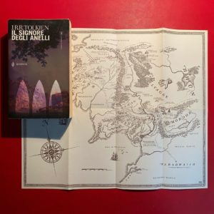 Nella mia copia ci sono solo due mappe: quella canonica e quella di Rohan e Gondor. Purtroppo le due mappe sono state inserite successivamente e incollate l’una alla seconda di copertina e l’altra alla terza di copertina in modo posticcio. Sarebbe stato più serio metterle tutte e tre magari una per volume e staccate in modo da poterle consultare durante la lettura . Purtroppo Bompiani-Giunti avversa fare le cose in modo accurato. Spero che siano più fortunati gli acquirenti dell’edizione a volume unico.