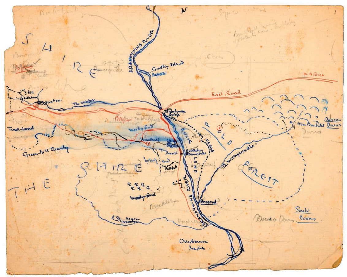 la mappa “Una parte della Contea” (pochi i fortunati ad averla vista nella benemerita edizione Astrolabio! Qui a destra una delle prime bozze) copre un’area geografica di circa 60 miglia da nord a sud e 105 miglia da est a ovest. Viene mostrata gran parte di tutti e quattro i Quartieri, tutta la Terra di Buck (il “Landaino” di Fatica) e un frammento di terra ad est della Contea. Per quanto riguarda la narrazione, la mappa consente al lettore di seguire le tracce di Frodo da casa sua fino alla Vecchia Foresta, coprendo fino a parte del capitolo 6 de La Compagnia dell’Anello, e poi torna utile per gli eventi narrati nel capitolo 8 de Il Ritorno del Re. È però importante notare come questa mappa riveli anche molti luoghi interessanti oltre quelli citati nella trama. Ventuno città e villaggi sono tracciati, più cinque frecce che indicano luoghi non mostrati e una freccia che indica la direzione per Brea. Vengono mostrati gli interi corsi dei fiumi Stock-brook (ruscello di Magione), Thistle Brook e Shirebourn, oltre a una parte di The Water (l’Acqua), the Withywindle, Brandywine (Baranduin) e un fiume senza nome che scorre da nord e sfocia nel Bywater Pool (Laghetto di Acquariva) che potrebbe essere il Norbourn (il fiume menzionato solo nell’indice dettagliato compilato da Tolkien ma non pubblicato). Sono presenti l’intera area boschiva di Woody End (il Fondo Boschivo), nonché parti del Bindbole Wood e la Vecchia Foresta. Quindi la mappa “Parte della Contea” fornisce una ricchezza di dettagli geografici per la Contea che non si trovano altrove. Ecco quindi l’altra novità: tutti questi nomi saranno presenti in italiano nella nuova traduzione che sta per uscire, anche quelli solo presenti in questa mappa.