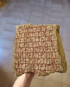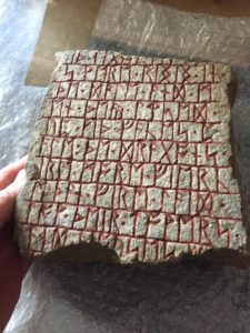 Non è vero che il postino suona sempre due volte. Suona solo una volta e se non si corre ad aprire la porta, spesso si perde il pacco che si aspetta da tempo. Così, proprio appostandosi dietro la porta con l’orecchio teso, si è potuto ricevere un nuovo cimelio per La Tana del Drago, dopo, la Mappa della Terra di Mezzo, l’Uovo di Fyrstan e il Gonfalone del Drago. Aprendo la scatola, si è scoperto quello che rimane di una pietra runica che descrive l’attacco del drago su Dale. «Si presume sia stata scolpita dai Nani nei tempi successivi alla fuga da Erebor», era il messaggio allegato dal donatore, Riccardo Cacciucchi. Sembra che l’appassionato lo abbia acquistato in un mercatino dell’usato da un antiquario che aveva lavorato presso il Dipartimento sull’Europa medievale del British Museum per poi passare al Burlington Fine Arts Club, una delle più prestigiose istituzioni private di mercanti d’arte d’Europa. La Pietra di Erebor è in realtà un frammento di una pietra runica molto più grande conficcata nel terreno, in seguito spezzata e questo è tutto ciò che ne rimane. La stele è in granito rosso e, prima di essere rimossa e riutilizzata come materiale da costruzione, probabilmente formava un monumento funebre.