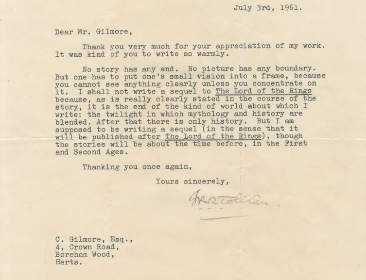 Chris Gilmore, professore di cristallografia dell’università di Glasgow, da ragazzo era un appassionato de Il Signore degli Anelli e aveva scritto a Tolkien. Con sua grande sorpresa, l’autore gli rispose con la lettera in questione. Negli anni Novanta la lettera fu donata da Gilson a un suo collega, Chick Wilson,