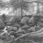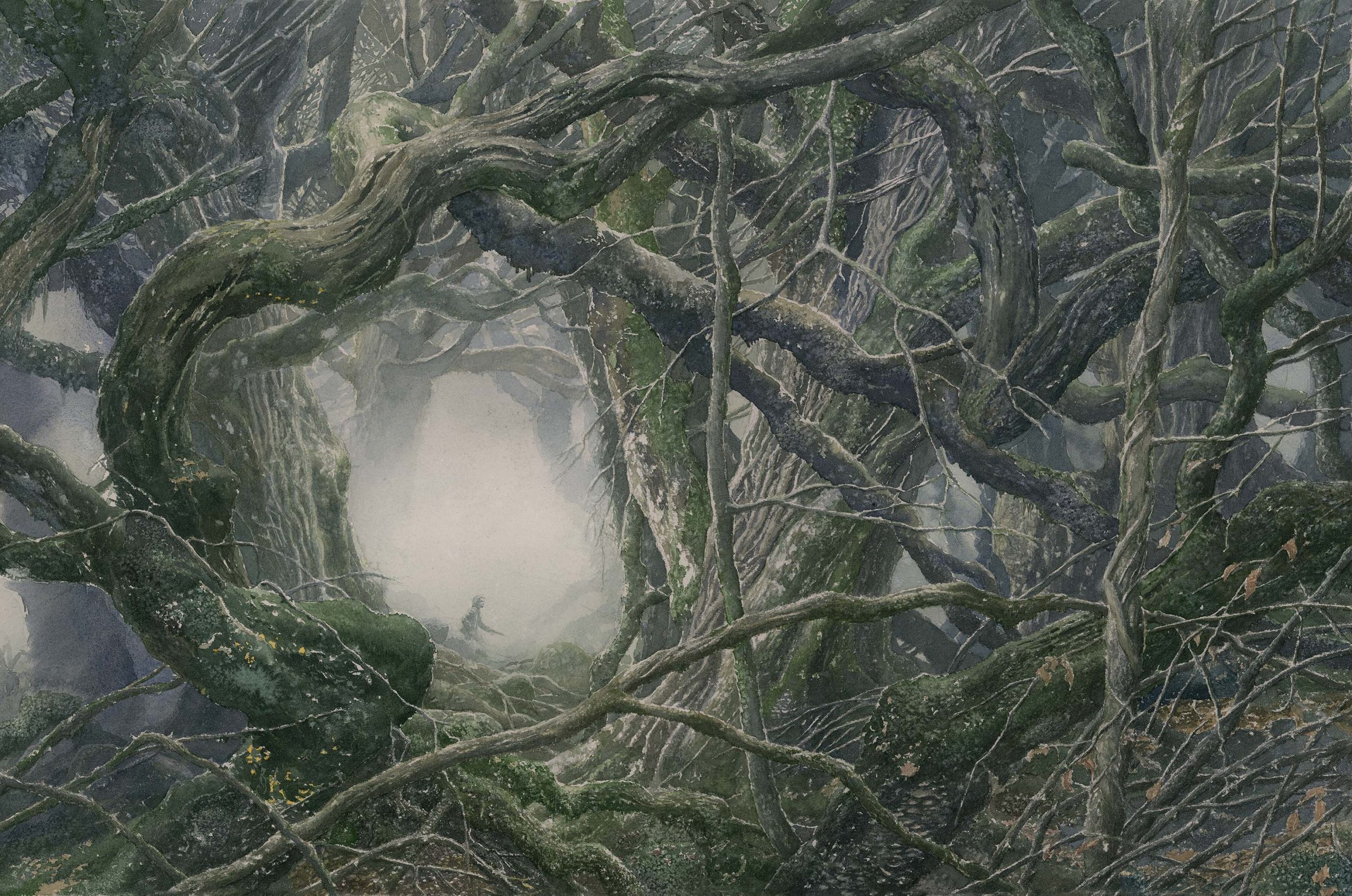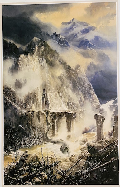 Alan Lee lesse per la prima volta Il Signore degli Anelli nel 1965 ed è sempre stato il suo libro preferito tra le opere di Tolkien: «Ho incontrato per la prima volta Lo Hobbit e Il Signore degli Anelli quando avevo diciotto anni», ricorda. «Era come se Tolkien avesse preso tutti gli elementi che avrei mai voluto in una storia e li avesse intrecciati in un’unica enorme narrazione senza soluzione di continuità. E, cosa ancora più importante per me, aveva creato un luogo: un vasto, bellissimo, fantastico paesaggio – che è rimasto nella mente molto tempo dopo che i protagonisti avevano terminato le loro battaglie e si erano separati». Come abbiamo raccontato nella puntata precedente, Alan Lee entrò con la sua arte nella Terra di Mezzo con il Tolkien Calendar 1987, illustrandolo insieme a un incredibile team di artisti visuali, di cui fecero parte anche Ted Nasmith, John Howe e Roger Garland. Lee divenne celebre nel 1991 quando, per celebrare il centesimo anniversario della nascita di Tolkien, la HarperCollins gli chiese di realizzare 50 dipinti per illustrare Il Signore degli Anelli. L’artista si è immerso in questo lavoro per due anni, ottenendo illustrazioni così perfette, e così universalmente acclamate, che sono ora ineluttabilmente legate alla grande storia di Tolkien per i lettori di tutto il mondo. La ricca edizione speciale rilegata del Signore degli Anelli chiamata Centenary Edition ha avuto nove ristampe in inglese ed è stata poi usata per le edizioni deluxe in italiano anche da Bompiani. Successivamente ha illustrato Tolkien’s Ring di David Day e l’edizione del 1997 di Lo Hobbit, le copertine dei volumi dal VI al IX della History of Middle Earth e numerose altre opere di Tolkien. L’artista, infatti, è sempre riuscito anche a tenere uno stretto legame con il mondo del libro, illustrando le pubblicazioni postume di Tolkien: I Figli di Húrin, Beren e Lúthien, La Caduta di Gondolin e la nuovissima edizione de I Racconti Incompiuti (2020), nonché Shapeshifters: Tales from Ovid’s Metamorphoses (raccontato di Adrian Mitchell) e The Wanderer (una splendida edizione della Folio Society di poesie in inglese antico). Nel 1998 ha vinto il Premio World Fantasy come miglior artista. La tecnica pittorica utilizzata da Alan Lee è da sempre l’acquerello, ma sono celebri suoi schizzi a matita, come quelli nei meravigliosi sketchbook dello Hobbit e del Signore degli Anelli.
