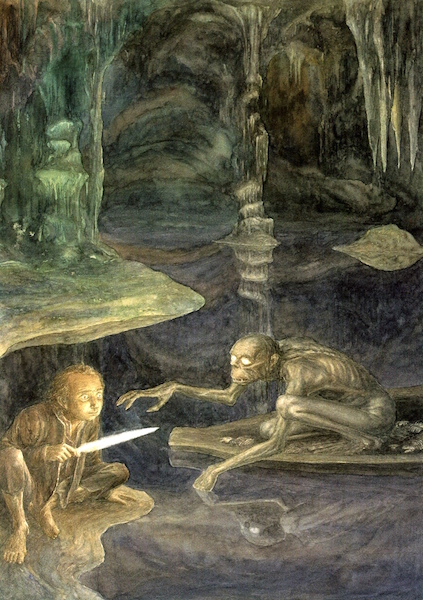 Il Tolkien Calendar 2013 è un calendario collettivo, con disegni di Alan Lee e John Howe che firmano sei tavole a testa. Le immagini di Alan Lee sono tratte ancora una volta dalla sua versione illustrata de Lo Hobbit pubblicata da HarperCollins nel 1997. Degna di nota è l’illustrazione di agosto 2013 Riddles in the dark, con un Bilbo paralizzato dal terrore alle prese con Gollum e i suoi indovinelli. È una scena iconica: la povera creatura è segnata dalla vita innaturale che gli ha donato l’Unico Anello, ben 500 anni. Gollum sfida il suo ospite a una gara di indovinelli, in cui la posta è la vita di Bilbo: in questo si vede l’influenza della mitologia norrena su Tolkien che riprende questo espediente da molte saghe in cui l’eroe rischia la vita in maniera simile. Sia Bilbo sia Gollum si rivelano molto bravi in questo gioco e la spiegazione è semplice: sono entrambi Hobbit cresciuti nella medesima cultura, anche se in periodi diversi.