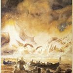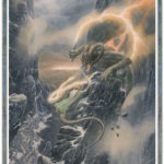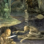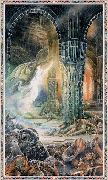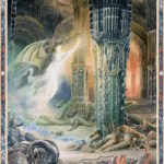 Per il Tolkien Calendar 2021 la casa editrice ha scelto di tornare alla formula collettiva, prendendo le immagini dalla recente edizione deluxe de I Racconti Incompiuti (2020). Gli artisti Alan Lee, John Howe e Ted Nasmith hanno realizzato per l’occasione 6 illustrazioni a testa e di queste 18 immagini complessive del volume, il calendario ne comprende 12. L’immagine selezionata per Lee in questo caso è quella del mese di novembre 2021, Glaurung Departs Nargothrond. Il drago Glaurung è uno dei nemici degli ELfi più potenti e pericolosi della Prima Era, grande alleato di Morgoth, ha un ruolo fondamentale nel saccheggio della città di Nargothrond. Il drago ne fece la sua dimora, ponendosi a guardia dei tesori rimasti. Nella scena illustrata, viene mostrato Glaurung mentre lascia la città verso quello che poi sarà il suo destino.