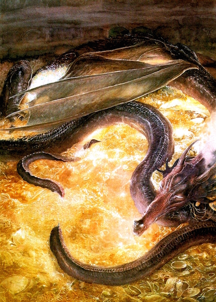 Essendo il volume pieno di schizzi in bianco e nero e immagini a colori dedicate a Lo Hobbit, l’immagine selezionata non poteva che essere quella che mostra l’antagonista principale del romanzo per il mese di novembre 2020: Smaug the Magnificent. L’illustrazione era già stata utilizzata anche per la copertina dell’edizione illustrata de Lo Hobbit nel lontano 1997. Nel libro, Smaug viene descritto come un drago enorme color oro rosso, con ali raccolte come un incommensurabile pipistrello e con il ventre incrostato di gemme e di frammenti d’oro a causa dei molti anni passati giacendo sul tesoro dei Nani. Tolkien descrive Smaug come una creatura «puramente intelligente», l’incarnazione del peccato, della superbia e dell’avarizia. L’illustrazione di Alan Lee rende bene tutte queste caratteristiche al punto che è divenuta l’immagine più comunemente associata al romanzo dello scrittore inglese.