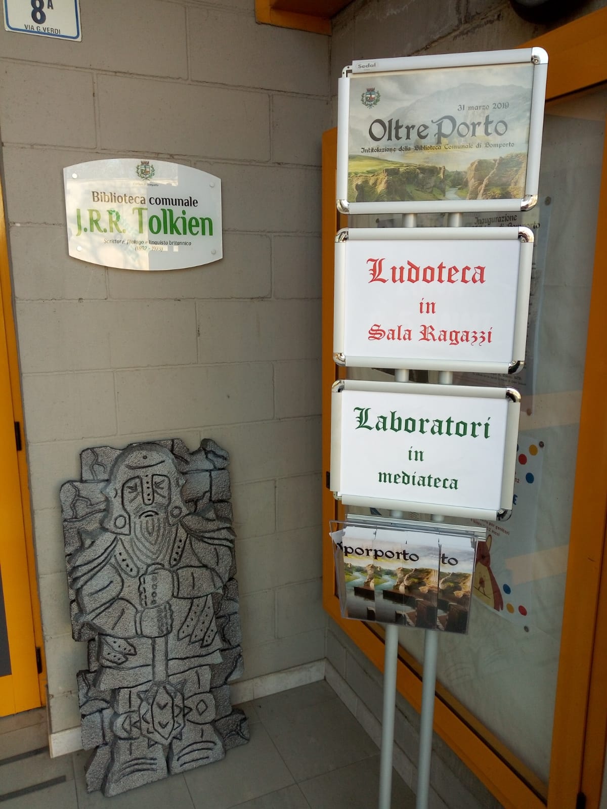 Appena due anni fa, il 31 marzo 2019, si era svolta la cerimonia di intitolazione della Biblioteca comunale di Bomporto che da quel momento è stata dedicata a J.R.R. Tolkien. In quel giorno si è svolta anche la prima “Festa del Fantasy” locale, con tanto di laboratori per ragazzi, laboratori di lingue elfiche, una caccia al tesoro, tavole rotonde, incontri con gli editori e gli artisti, oltre alla conferenza “Potere e Magia” tenuta da Claudio A. Testi, con accompagnamento musicale dei giovani del Mithril Duo. Durante l’evento, era stato proiettato il lungometraggio animato Il Signore degli Anelli di Ralph Bakshi (1978), la pellicola che ha in parte ispirato la trilogia di Peter Jackson. Tra gli altri, oltre a Claudio Testi, erano presenti gli artisti Ivan Cavini, Fabio Porfidia, Davide Romanini, Emanuele Manfredi, Livia de Simone e l’esperta Sara Gianotto.