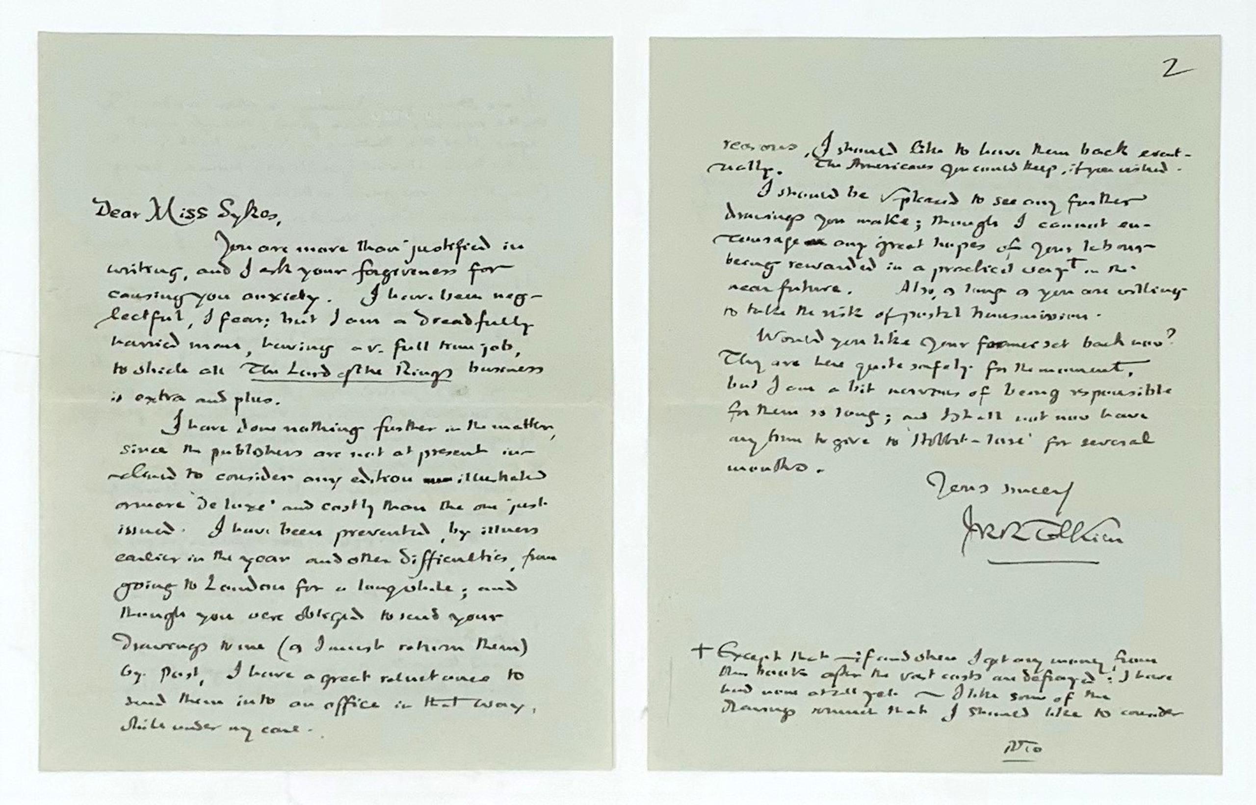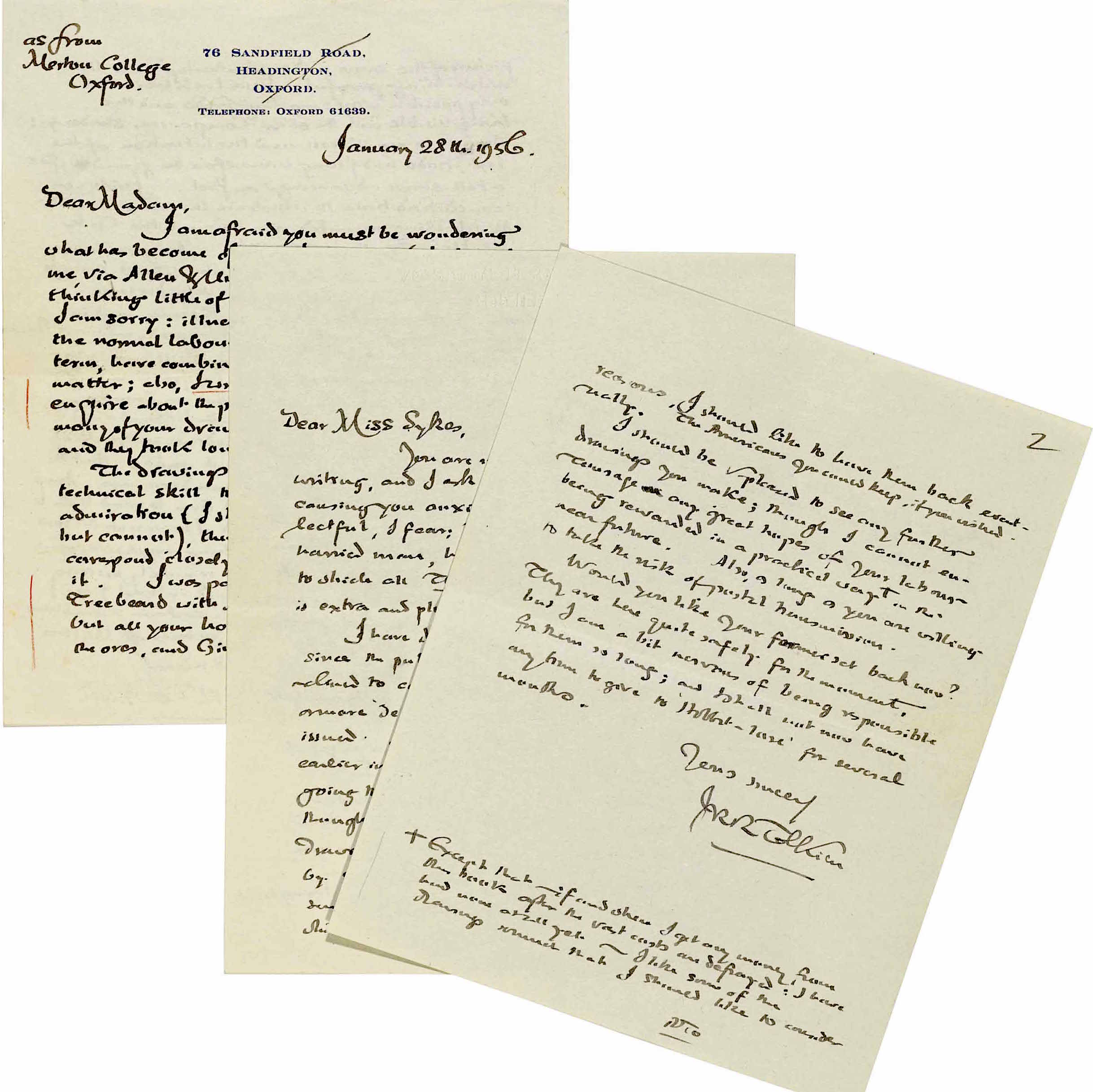 Ecco la totalità della lettera: «Cara signorina Sykes, Lei è più che giustificata per iscritto e le chiedo perdono per averle causato ansia. Sono stato negligente, temo, ma sono un uomo terribilmente tormentato da un lavoro a tempo pieno per aggiungere tutta la faccenda de Il Signore degli Anelli. Non ho fatto altro in merito poiché gli editori non sono attualmente propensi a considerare alcuna edizione illustrata o più “di lusso” e costosa di quella appena pubblicata. Mi è stato impedito, a causa di una malattia all’inizio dell’anno e di altre difficoltà, per molto tempo di andare a Londra; e sebbene lei sia stata obbligata a mandarmi i suoi disegni (e io li devo restituire) per posta, ho una grande riluttanza a mandarli con quella modalità, mentre sono sotto la mia cura. Ho mostrato i suoi disegni ad altri “lettori” e la risposta è stata buona; anche se la maggior parte concorda sul fatto che il modo migliore di disegnare gli Hobbit è renderli esseri umani assolutamente ordinari (tranne che per i peli che coprono per la parte inferiore delle gambe e superiore dei piedi), e non troppo infantili, con gli occhi tondi ecc. Non riesco a ricordare quali note ho menzionato (non avendo segretaria, non ho copie, a meno che non le digiti io). Ma penso che ciò di cui ha bisogno sia una copia del libro. Mi dispiace di non averne più (salvo la mia copia!); ma se vuole, potrei mandarle alcune copie difettose che funzionerebbero lo stesso: