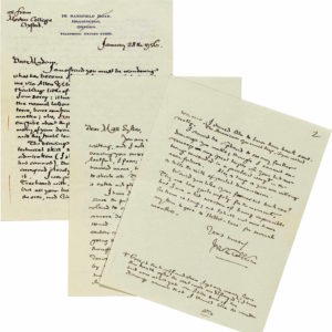 Sarei molto contento di vedere gli eventuali ulteriori disegni che ha fatto; anche se non posso incoraggiare grandi speranze che il suo lavoro venga ricompensato in modo pratico nel prossimo futuro. Inoltre, fintanto che è disposta a correre il rischio di una trasmissione tramite posta. Vorrebbe indietro adesso il suo precedente set? Sono qui abbastanza al sicuro per il momento, ma sono un po’ nervoso di esserne responsabile così a lungo (…). Tranne che – se e quando riceverò dei soldi dal libro dopo le enormi spese sono state sostenute: non ne ho ancora avuto nessuno – mi piacciono così tanto alcuni disegni che vorrei considerare di chiederle di permettermi di acquistarne alcuni per me, in caso di rinvio a tempo indeterminato di un’edizione illustrata».