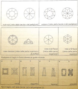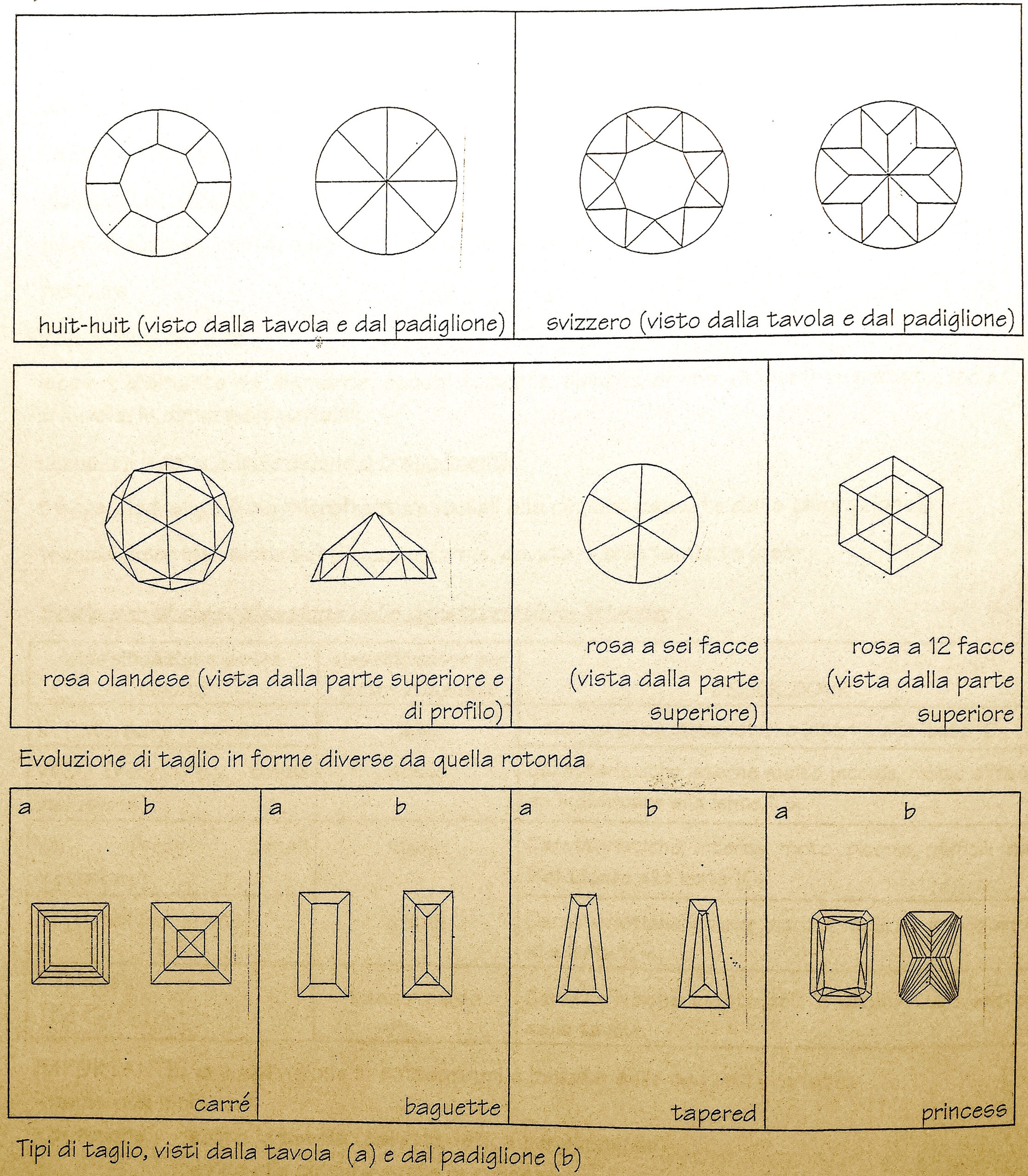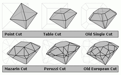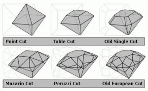 Ritorniamo al diamante. Nella storia di questa pietra vi sono stati numerosissimi tentativi di darle un taglio che esaltasse al meglio la sua brillantezza. Tuttavia poco si sa sulla storia del taglio per il segreto che per un centinaio di anni tennero incisori e tagliatori. Probabilmente iniziò in India nel XIV secolo, e in Europa quando perse validità un editto che ne vietava il taglio; infatti si era ritenuto fino ad allora che alterare la forma naturale, o grezza, del diamante ne avrebbe distrutto le proprietà magiche(39).
