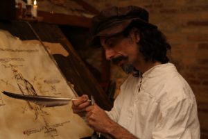 Una delle vecchie conoscenze dell’AIST è Stefano Gelao, ospite spesso alle attività culturali dell’Associazione da Fantastika 2018 a Lucca Comics and Games. Noto ai più con il nome di “Amanuense tolkieniano”, Gelao è attratto dai pennini fin dalla più tenera età, ha conseguito studi classici e ha lavorato per anni nel campo della grafica e del design. Ha studiato presso alcuni dei migliori calligrafi del mondo prima di aprire il proprio scriptorium amanuense Scritto a Mano. Per l’AIST, Gelao ha inaugurato la Tana del Drago con la Mappa della Terra di Mezzo, realizzata come avrebbero potuto essere vergate nel mondo tolkieniano, con penna d’oca, inchiostri artigianali e cartapecora. Oggi è finita tra i Cimeli della Tana perché è su vellum (pergamena particolarmente fine da una pelle di vitello, ricavata da animali nati morti) di 80×60 cm, stesa a telaio con i tiranti di canapa, con il telaio fatto a mano su misura proprio per quello specifico pezzo, con oro in conchiglia, tempera all’uovo e rosso vermiglione – è il solfuro mercurico rosso (il cinabro) e anche altri minerali di colore rosso adoperato come pigmento per colorare -, con l’inchiostro ferrogallico, fatto a mano con la ricetta medievale e l’uso della penna d’oca… Ora è un esemplare unico al mondo e se ne può scoprire presto il motivo!