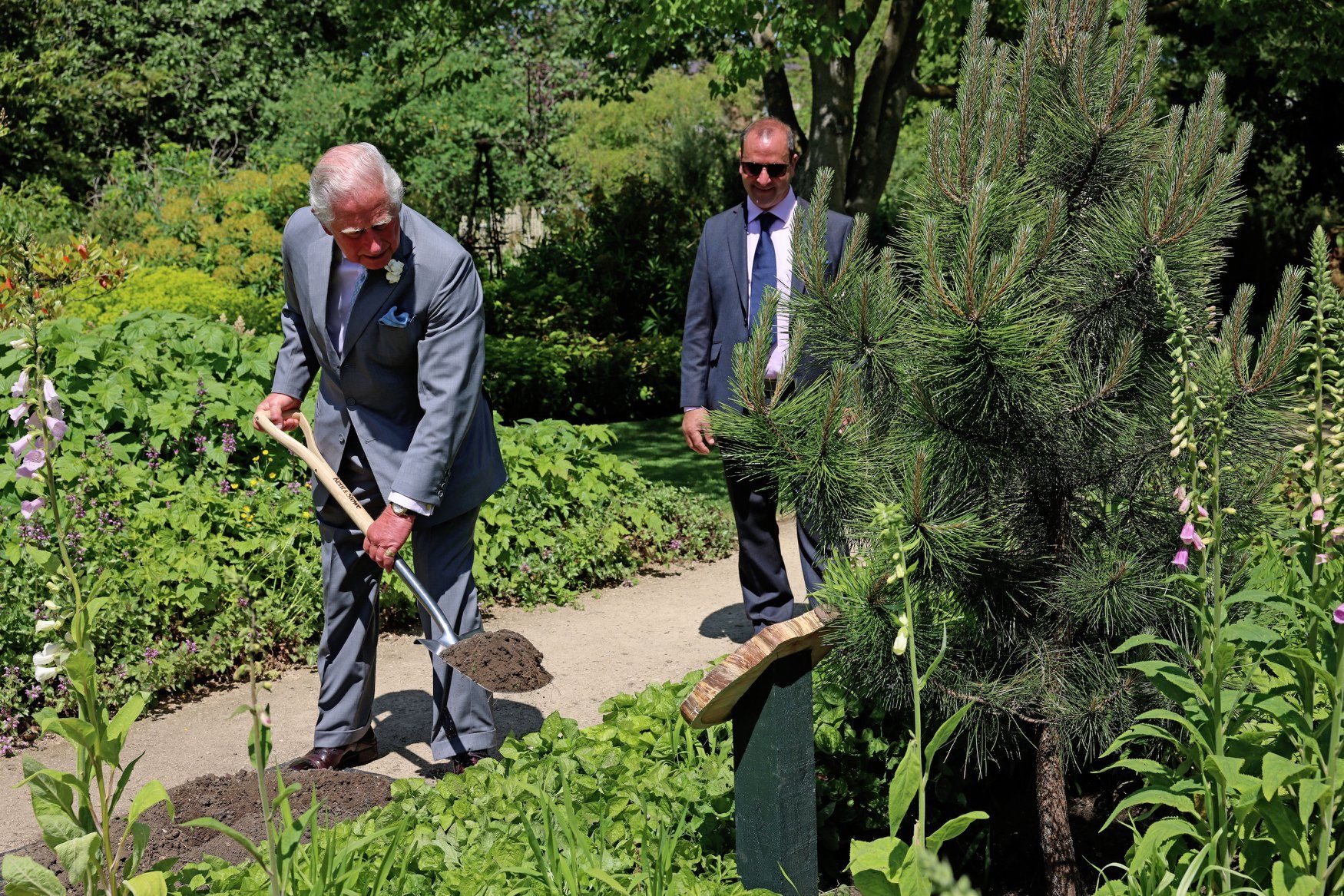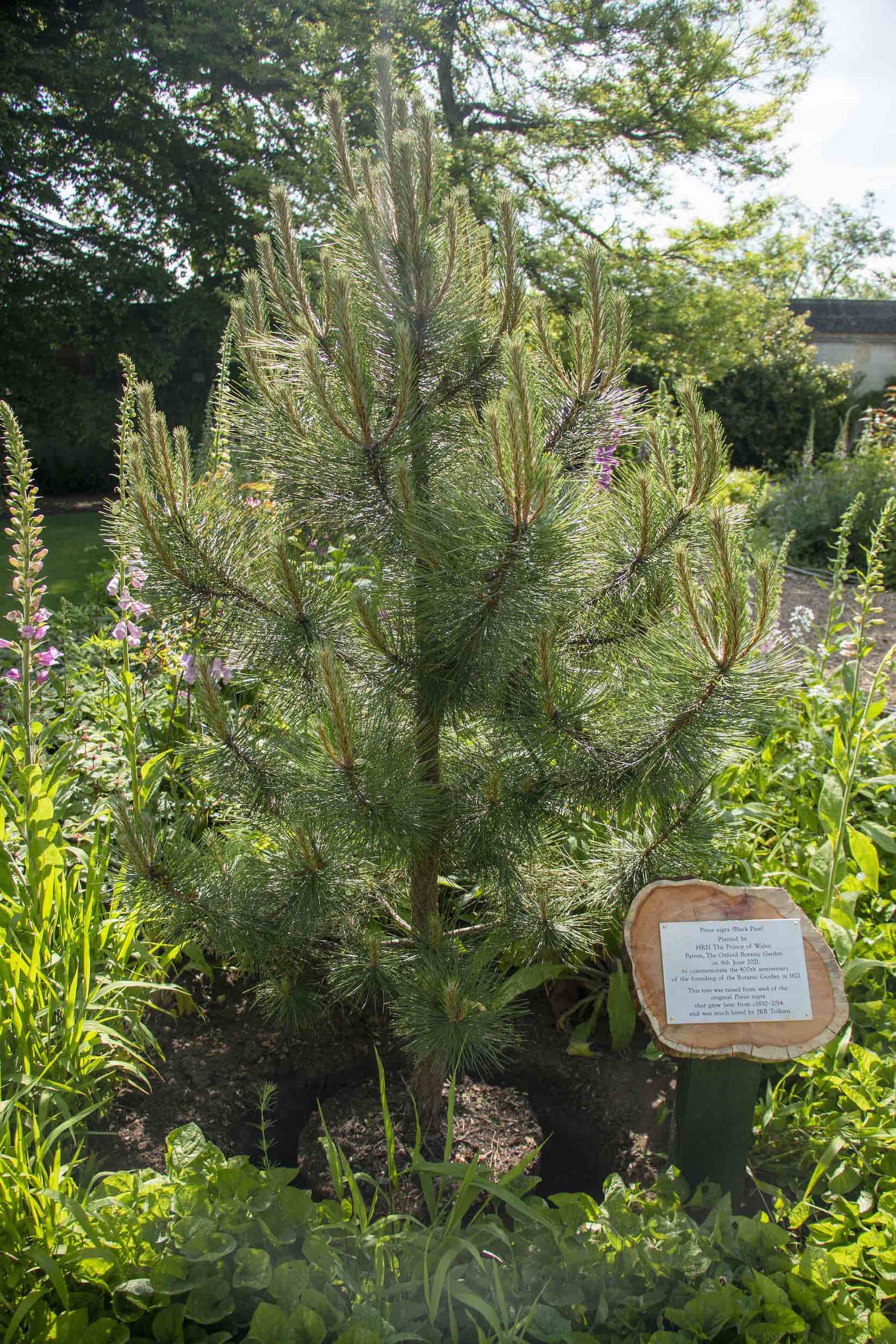 presidente degli amici del giardino botanico di Oxford, il professor Richard Mayou, ex presidente e Mark Brent, curatore e capo dell’orticoltura. Nella sezione letteraria del giardino, il principe ha piantato un albero molto amato dallo scrittore J.R.R. Tolkien. Si tratta di un albero cresciuto da un seme di un pino nero precedentemente piantato nel 1830, che era uno degli alberi di Oxford preferiti da Tolkien, tanto che l’ultima foto di Tolkien in vita fu scattata sotto questo albero.