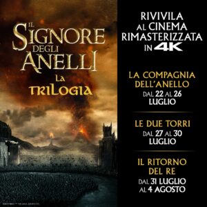 In occasione dei vent’anni dall’uscita del primo capitolo, Il Signore degli Anelli, la trilogia ispirata alla pagine di J. R. R. Tolkien e diretta da Peter Jackson, ritorna al cinema, nella versione rimasterizzata e in 4K realizzata dal regista stesso. A febbraio scorso, la saga era uscita di nuovo negli Stati Uniti è tornata al cinema in 2K, 4K e IMAX. Per l’Italia la conferma è arrivata da UCI Cinemas, che ha anche svelato le date in cui sarà possibile vedere ogni film. Nello specifico, la maratona estiva partirà con La Compagnia dell’Anello (uscito al cinema nel 2001), in programma dal 22 al 26 luglio. Si proseguirà con Le due torri (uscito al cinema nel 2002) dal 27 al 30 luglio e si concluderà con Il ritorno del re (uscito al cinema nel 2003) dal 31 luglio al 4 agosto.