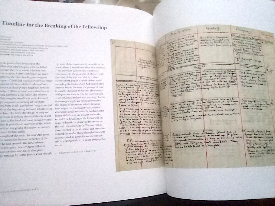 Durante la stesura de Il Signore degli Anelli, Tolkien scoprì che per mantenere sincronizzati tutti i movimenti dei suoi personaggi – sempre con scrupolosa attenzione alle distanze percorse – doveva elaborare uno schema temporale “sinottico”. Questo è un documento affascinante, mai pubblicato prima. William Cloud Hicklin ha dato nuovi dettagli: «[Tolkien] iniziò con schemi temporali lineari, cioè elencando tutti gli eventi di ogni giorno in una singola sequenza. Man mano che la storia cresceva nella complessità narrativa, tuttavia, queste si rivelarono inadeguate e quindi, quando iniziò quello che oggi è il Libro V nell’ottobre 1944, le discrepanze cronologiche che si erano insinuate nel testo lo portarono a creare uno schema temporale in colonne parallele, permettendogli di giorno dopo giorno per seguire le azioni dei suoi vari gruppi di personaggi. Questa prima cronologia “sinottica”, che Christopher Tolkien designò S, si esaurì quando il Libro V si sviluppò nel 1946 e fu sostituita da un’altra, che chiamerò S2. S2 rimase la cronologia di lavoro almeno fino all’aprile 1948 (c’è una nota datata) e quasi certamente fino a dopo il completamento della storia quell’estate, anche se lo schema temporale stesso si interrompe dopo la battaglia del Pelennor. S2 servì quindi da veicolo per la conversione di Tolkien del calendario, che era stato il gregoriano durante la stesura del libro, al nuovo calcolo della Contea. La cronologia finale, S3, fu il terzo e ultimo di questi schemi “sinottici”, scritto molto probabilmente verso la fine della prima fase di lavoro sulle Appendici intorno al 1949-50, e sicuramente dopo che la prima stesura del racconto era stata completata. Anche in quel momento la cronologia non era stata stabilita, e Tolkien modificò le cose con sua soddisfazione sia nella creazione, sia nelle successive correzioni, di S3 che a loro volta portarono a revisioni nel testo.