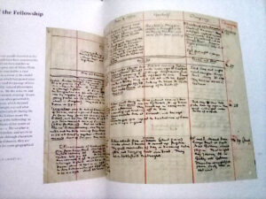 Le prime due pagine (un foglio), scritte su carta a righe da 13 pollici nel modo normale, sono uno schema temporale lineare della storia da Hobbiton all’ingresso in Lorien. I successivi sei (tre fogli) usano la stessa carta ma sono orientati al paesaggio e divisi in colonne per le dramatis personae (queste cambiano costantemente secondo necessità), con una riga per ogni data, dal 15 gennaio al 7 marzo. La pagina successiva, la nona, seguì l’esempio; ma si è trasformata in un guazzabuglio di alterazioni, barrature, inserimenti, frecce direzionali e alla fine è diventata un tale caos che Tolkien l’ha scartata (è stata trovata separatamente negli archivi) e l’ha sostituita. Da questo momento ha usato pagine bianche da libretti d’esame, il suo mezzo abituale per la stesura. Come spesso accade, ciò che era iniziato come una copia “finale” era diventato solo un lavoro grossolano (è anche possibile che abbia semplicemente finito la carta dell’altro giornale!). Le nuove pagine 9-11 continuano lo schema temporale multicolonna fino alla caduta di Sauron il 25 marzo. Il retro della pagina 11 è stato lasciato vuoto e 12-14 tornano alla modalità lineare verticale, non essendo più necessarie le colonne, fino al ritorno di Sam a Bag End il 6 ottobre 1421. A un certo punto, sono propenso a pensare molto più tardi, intorno al 1954, mentre lavorava a “The Great Years”, Tolkien annotò alcune voci in stile Appendice B sul retro di pag.11, tutte dedicate agli eventi globali dopo la caduta della Torre Nera. Seguono poi più di 15 pagine del mio blaterare su quanto sopra, e un numero empio di note a piè di pagina. Il blaterare in realtà copre molto di più di questo documento, perché mi sono ritrovato a descrivere nel bene e nel male lo sviluppo di tutte e tre le cronologie “sinottiche” e la loro interrelazione con lo sviluppo della narrazione stessa. Questo vale anche per S3: sebbene la storia fosse “finita”, fare S3 ha indotto Tolkien a rivedere completamente la settimana che precedette il Pelennor, e di conseguenza a riscrivere tutti i molti, molti passaggi convergenti su Minas Tirith».