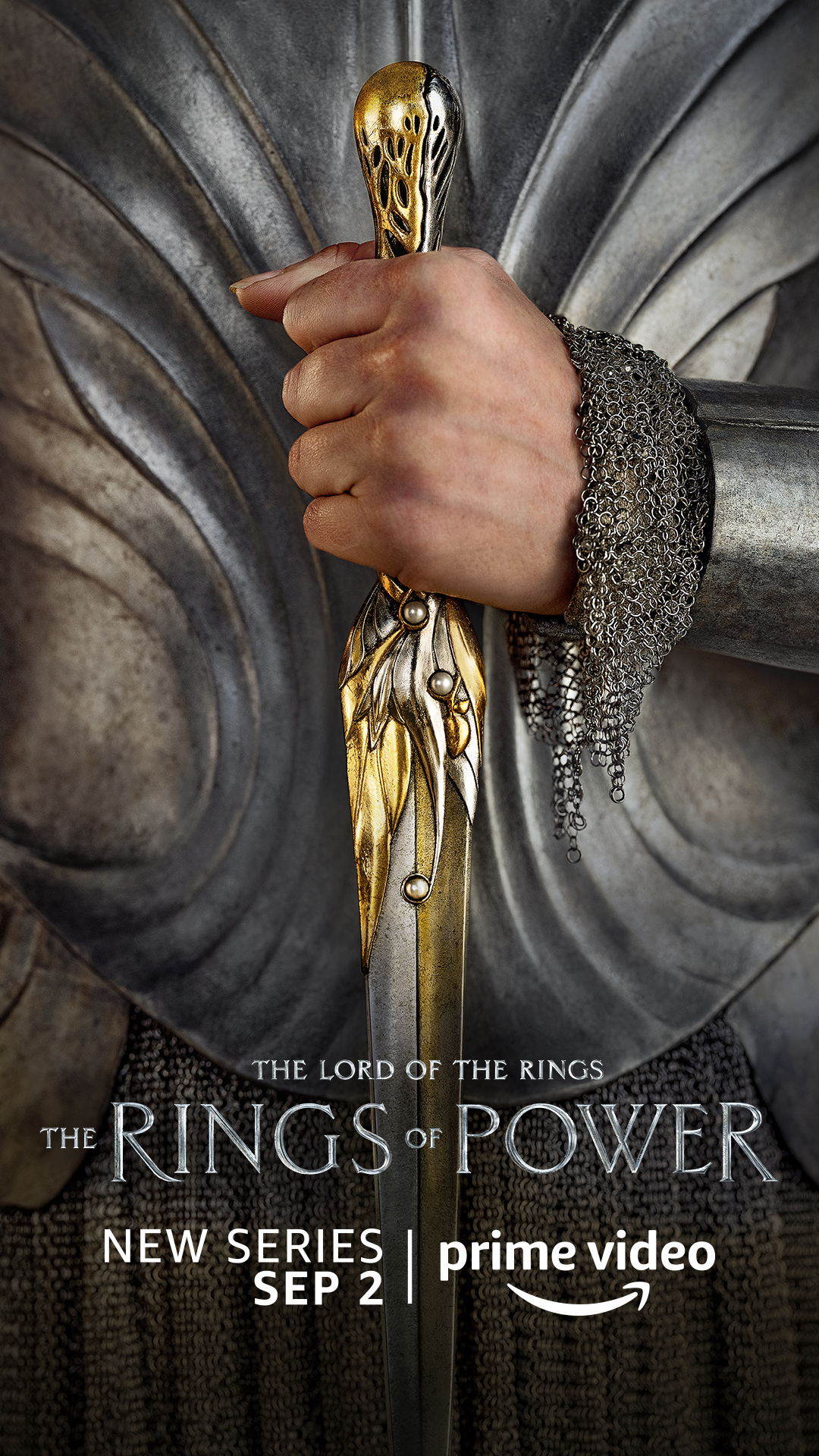Con questo poster iniziamo a ipotizzare i personaggi quelli top di questa serie. Senza tanti giri di parole possiamo asserire, almeno al 90%, che l’immagine che vedete sopra è quella appartenente alla giovane Galadriel. Tutto riconduce alla dama elfica dai lunghi capelli dorati. Le mani così ben curate e allungate, l’armatura (con dei fregi tipici dei reami elfici) fa scoprire un corpo femminile con un punto vita a clessidra. La spada, che presumiamo sia molto lunga e fina (quasi un lungo pugnale) ha nella sua elsa un dettaglio veramente importante: i due alberi Telperion e Laurealin incrociati l’uno sull’altro con i loro colori argentei e dorati. L’oro e l’argento si fondono probabilmente fino alla fine della spada creando un’arma veramente particolare. Altro elemento che ci riconduce alla fisionomia femminile è la cotta di maglia sotto l’armatura, tra l’altro molto vicina a quella degli elfi di Peter Jackson, che fa ancor di più risaltare il corpo della stessa Galadriel. Inoltre il dettaglio che può fa ben sperare è che Galadriel nella prima e seconda era ha una quotidianità differente dalla vita di Lothlorien: una donna molto atletica, che partecipava a moltissime gare, possiamo definirla quasi una sorta di amazzone.